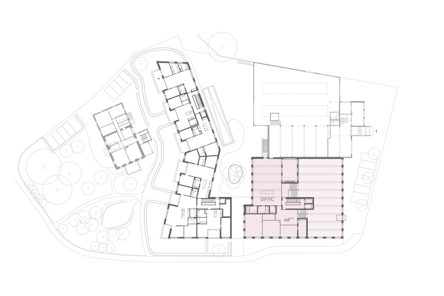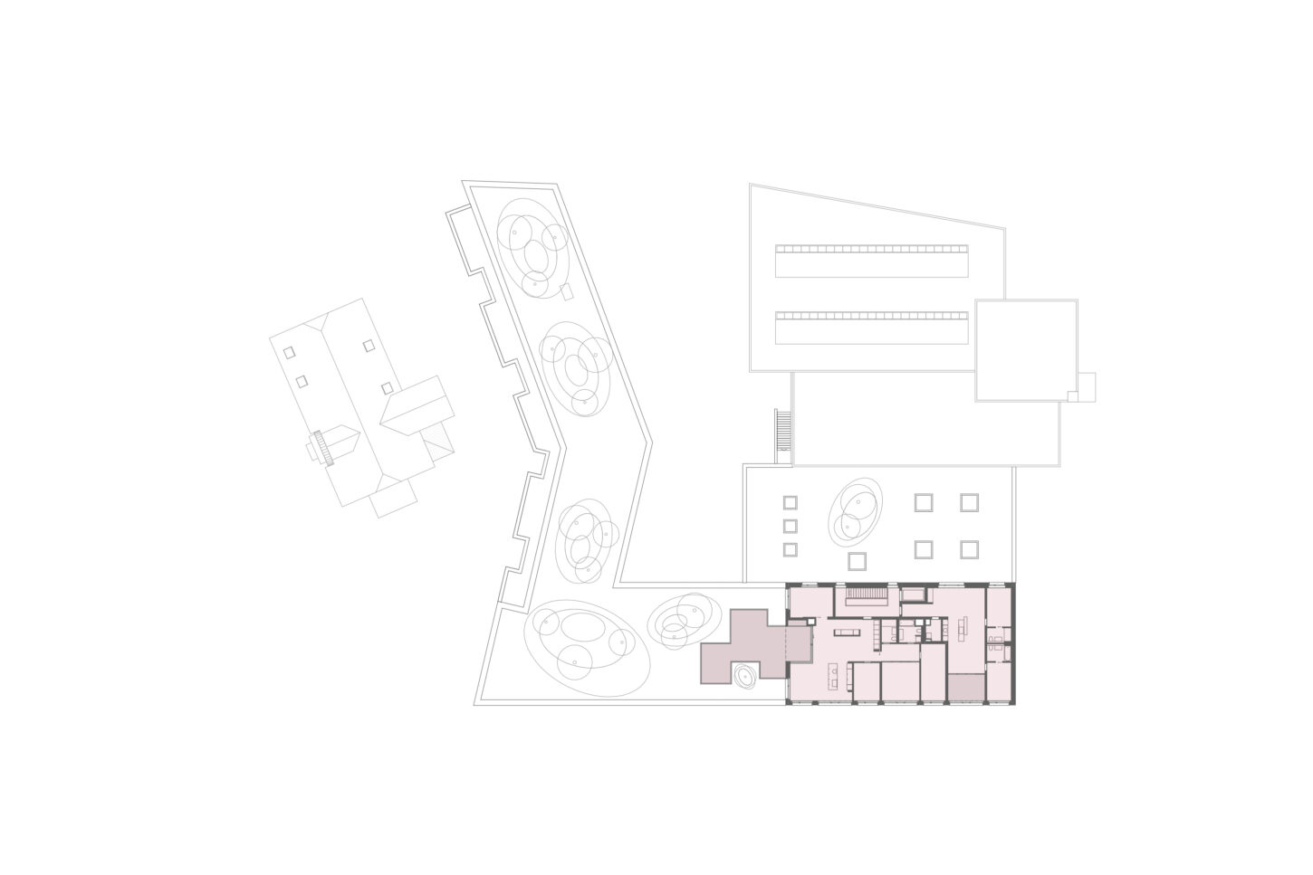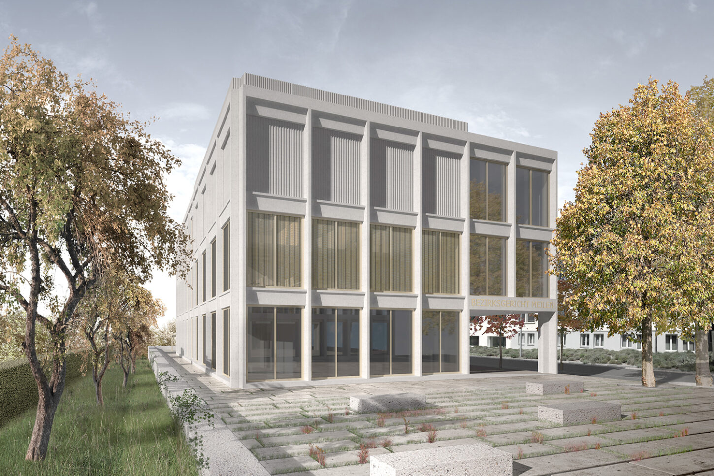 Die Erweiterung für das Gerichtsgebäude liegt in einem heterogenen Wohnquartier. Die Einstellhalle dient als Sockel und definiert mit der Gerichtslinde den grosszügigen Vorplatz vor dem Eingang. Der rückwärtige Obsthain schafft die nötige Distanz zu den angrenzenden Wohnhäusern.