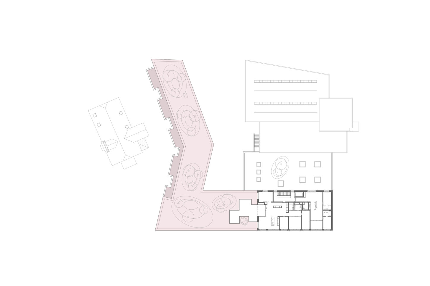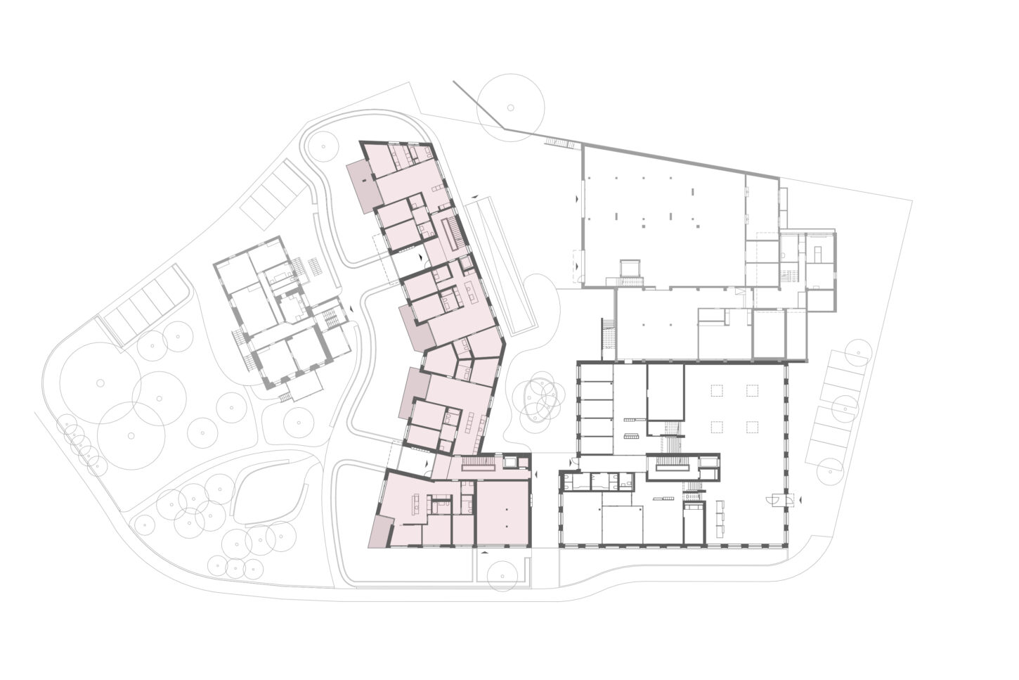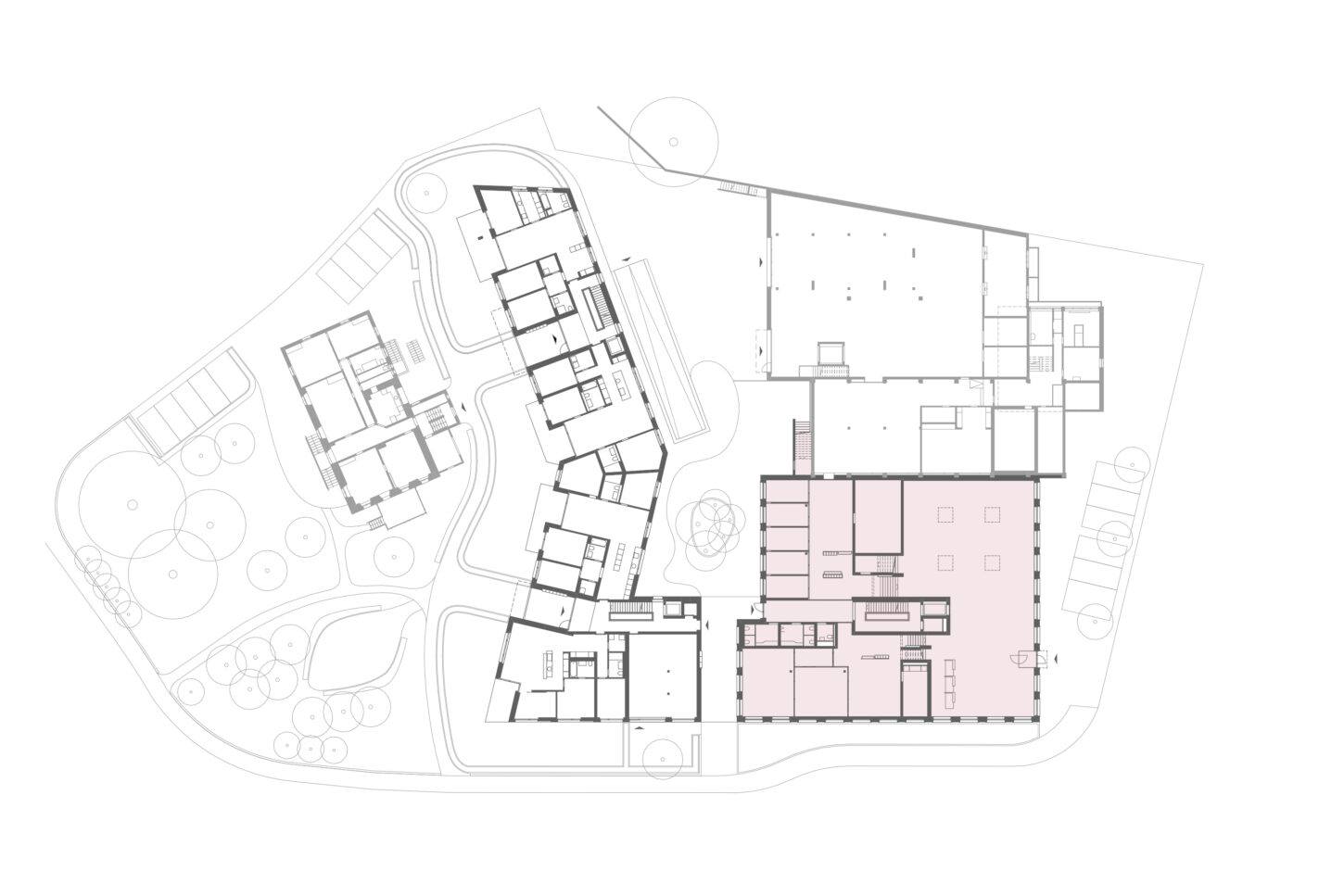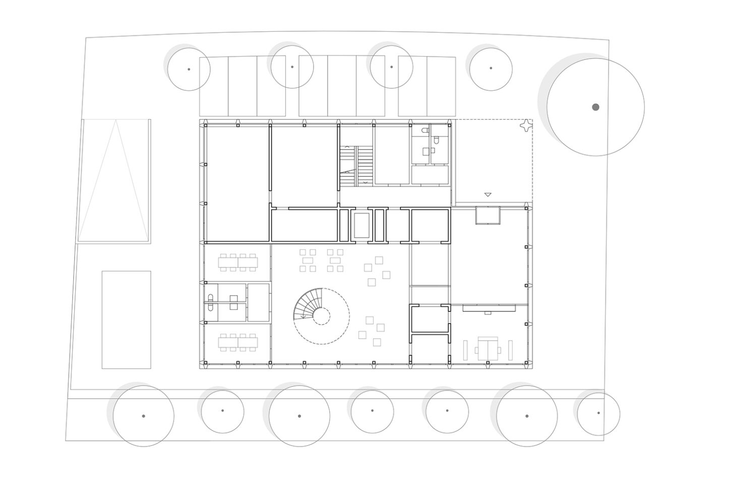 Die Erweiterung für das Gerichtsgebäude liegt in einem heterogenen Wohnquartier. Die Einstellhalle dient als Sockel und definiert mit der Gerichtslinde den grosszügigen Vorplatz vor dem Eingang. Der rückwärtige Obsthain schafft die nötige Distanz zu den angrenzenden Wohnhäusern.