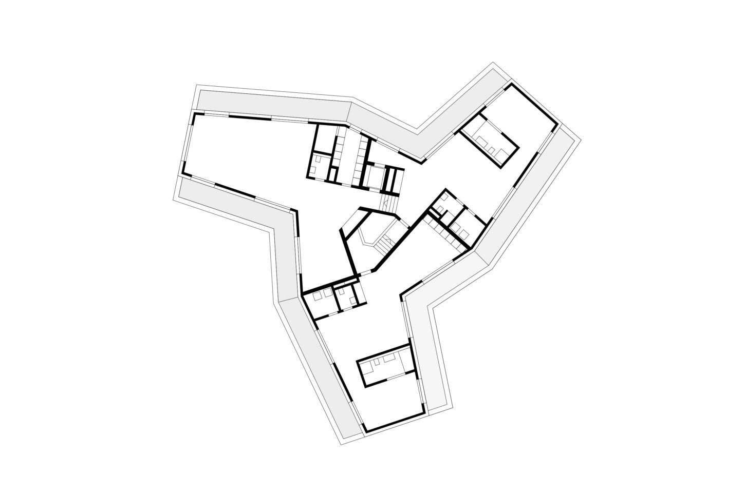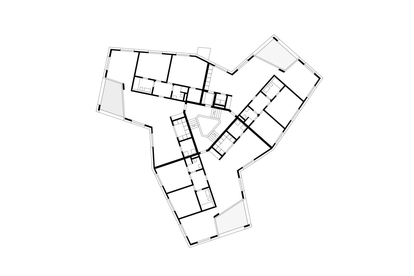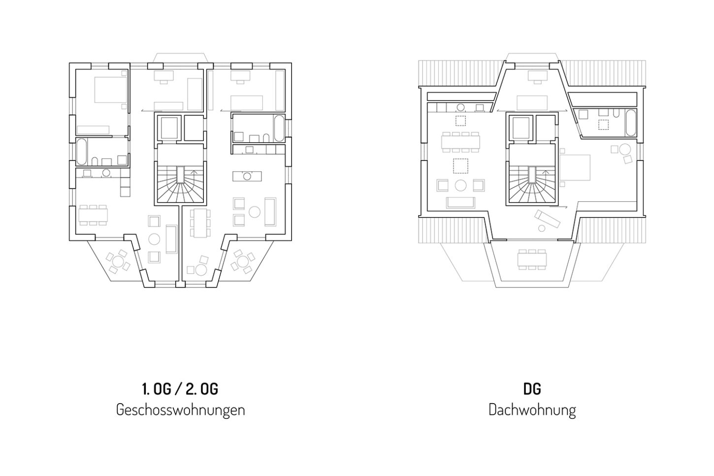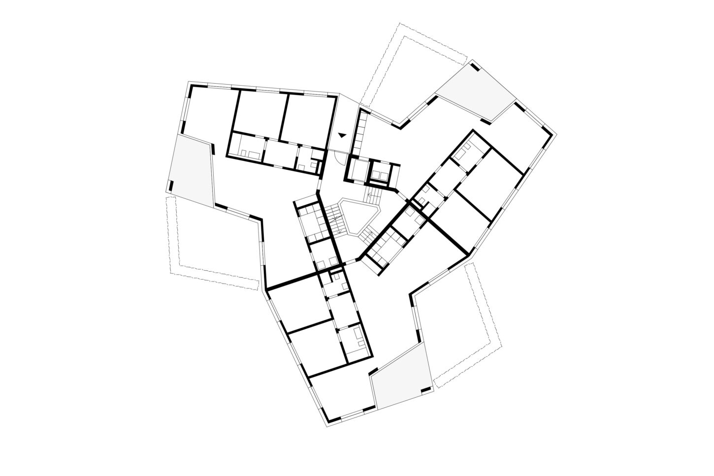 Im Zusammenspiel von Topografie und Bauvorschriften wurde ein Split-Level-Konzept erarbeitet, das jeweils drei Wohnungen versetzt anordnet. Im zentralen Treppenhaus werden die Wohnungen durch eine kontinuierliche Kaskadentreppe erschlossen. Während alle bedienten Räume gut belichtet an der Fassade angeordnet sind, wurden die dienenden Räume im Innern der Wohnung zusammengefasst. Alle Wohnungen sind voneinander weg gerichtet, jeweils dreiseitig orientiert und haben private, von den anderen Wohnungen nicht einsehbare Aussenräume. Das zusammenhängende Raumgefüge von Ess-Wohn-Loggia-Zimmer bietet Grosszügigkeit. Einerseits mit Durchblicken innerhalb der Wohnung und andererseits mit Sicht in die Umgebung. Durch Fassadenknicke entstehen im Raum Verengungen die zonieren und private Bereiche zum Rückziehen erlauben.