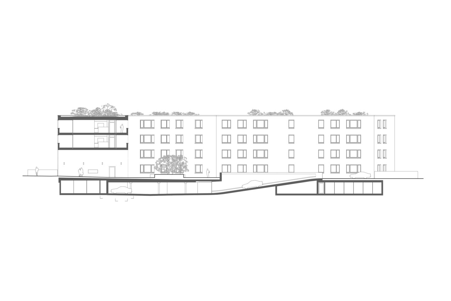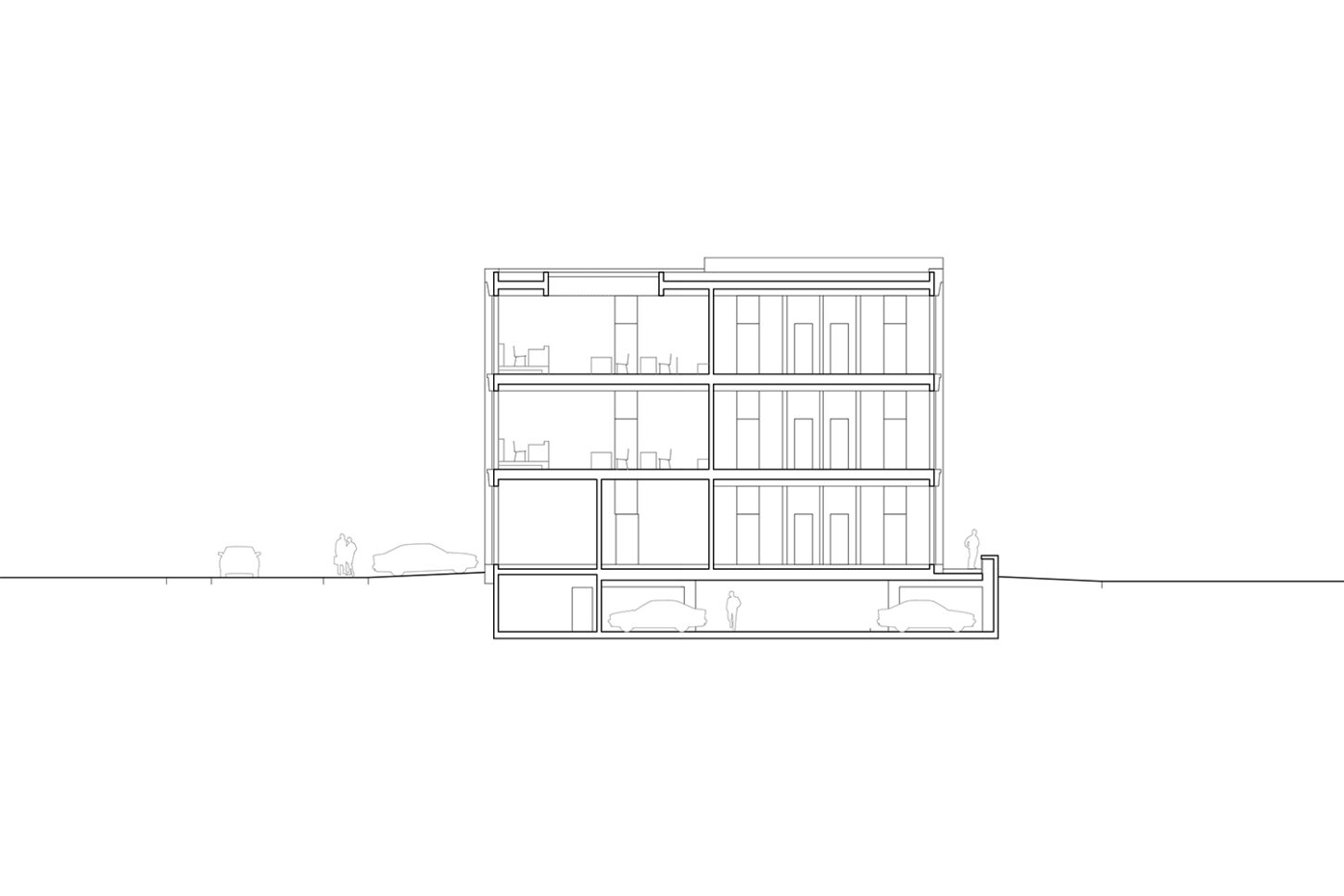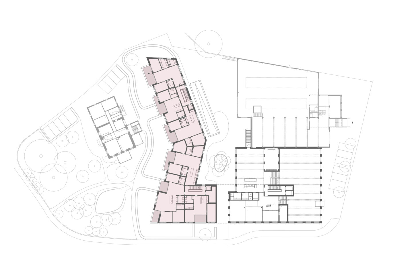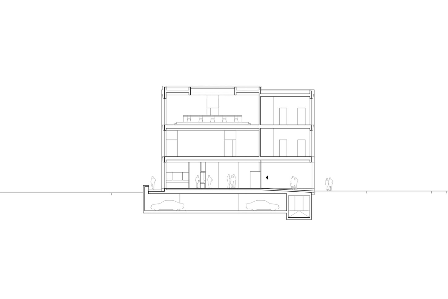 Im Zusammenspiel von Topografie und Bauvorschriften wurde ein Split-Level-Konzept erarbeitet, das jeweils drei Wohnungen versetzt anordnet. Im zentralen Treppenhaus werden die Wohnungen durch eine kontinuierliche Kaskadentreppe erschlossen. Während alle bedienten Räume gut belichtet an der Fassade angeordnet sind, wurden die dienenden Räume im Innern der Wohnung zusammengefasst. Alle Wohnungen sind voneinander weg gerichtet, jeweils dreiseitig orientiert und haben private, von den anderen Wohnungen nicht einsehbare Aussenräume. Das zusammenhängende Raumgefüge von Ess-Wohn-Loggia-Zimmer bietet Grosszügigkeit. Einerseits mit Durchblicken innerhalb der Wohnung und andererseits mit Sicht in die Umgebung. Durch Fassadenknicke entstehen im Raum Verengungen die zonieren und private Bereiche zum Rückziehen erlauben.