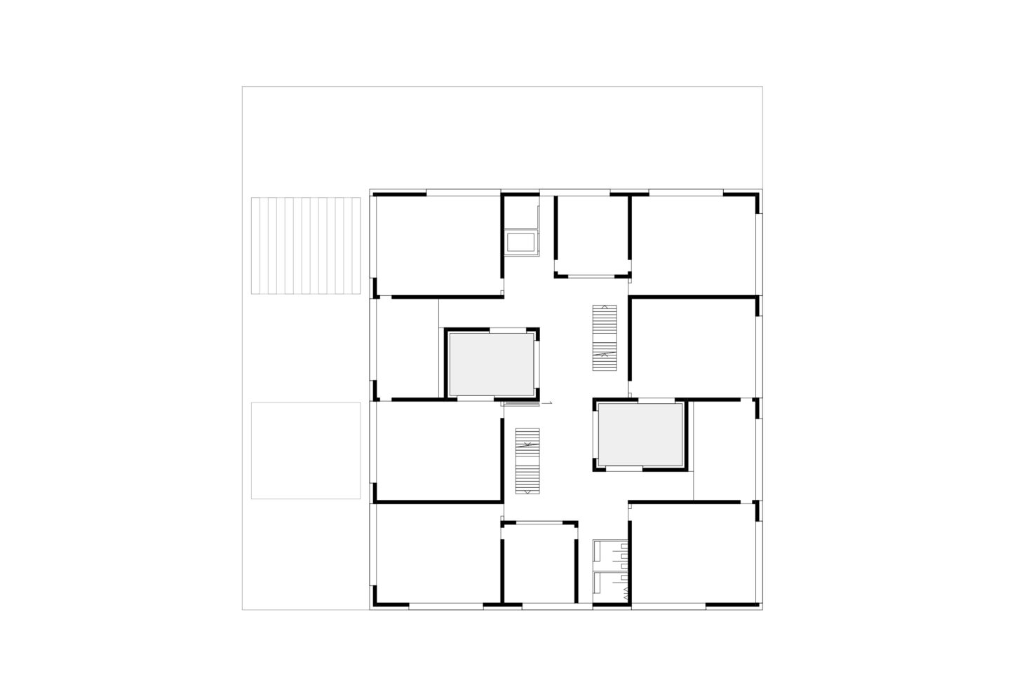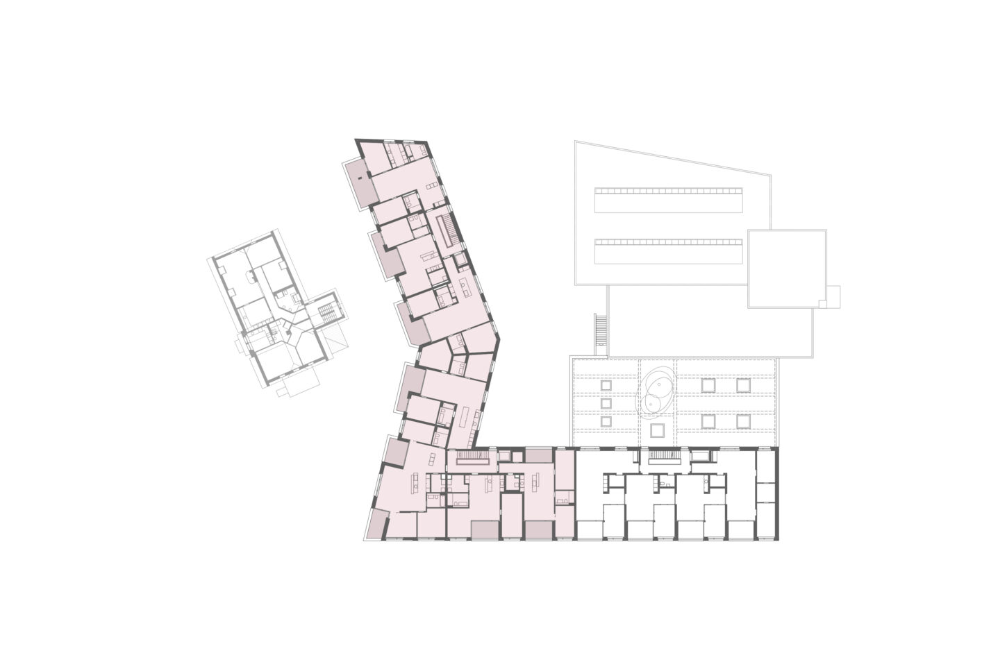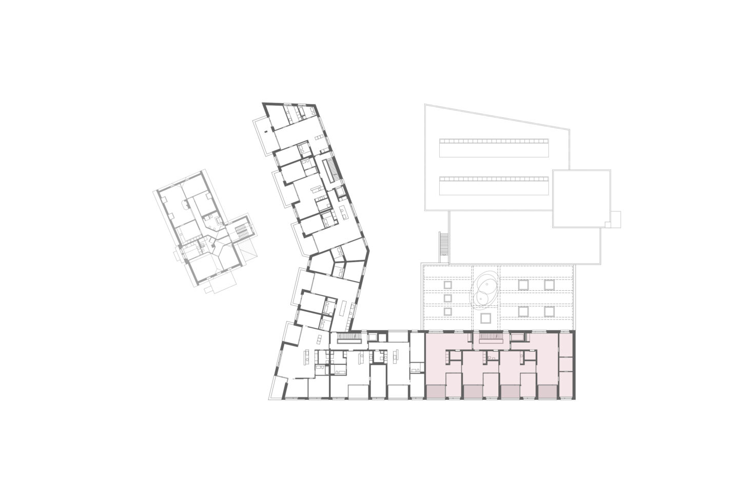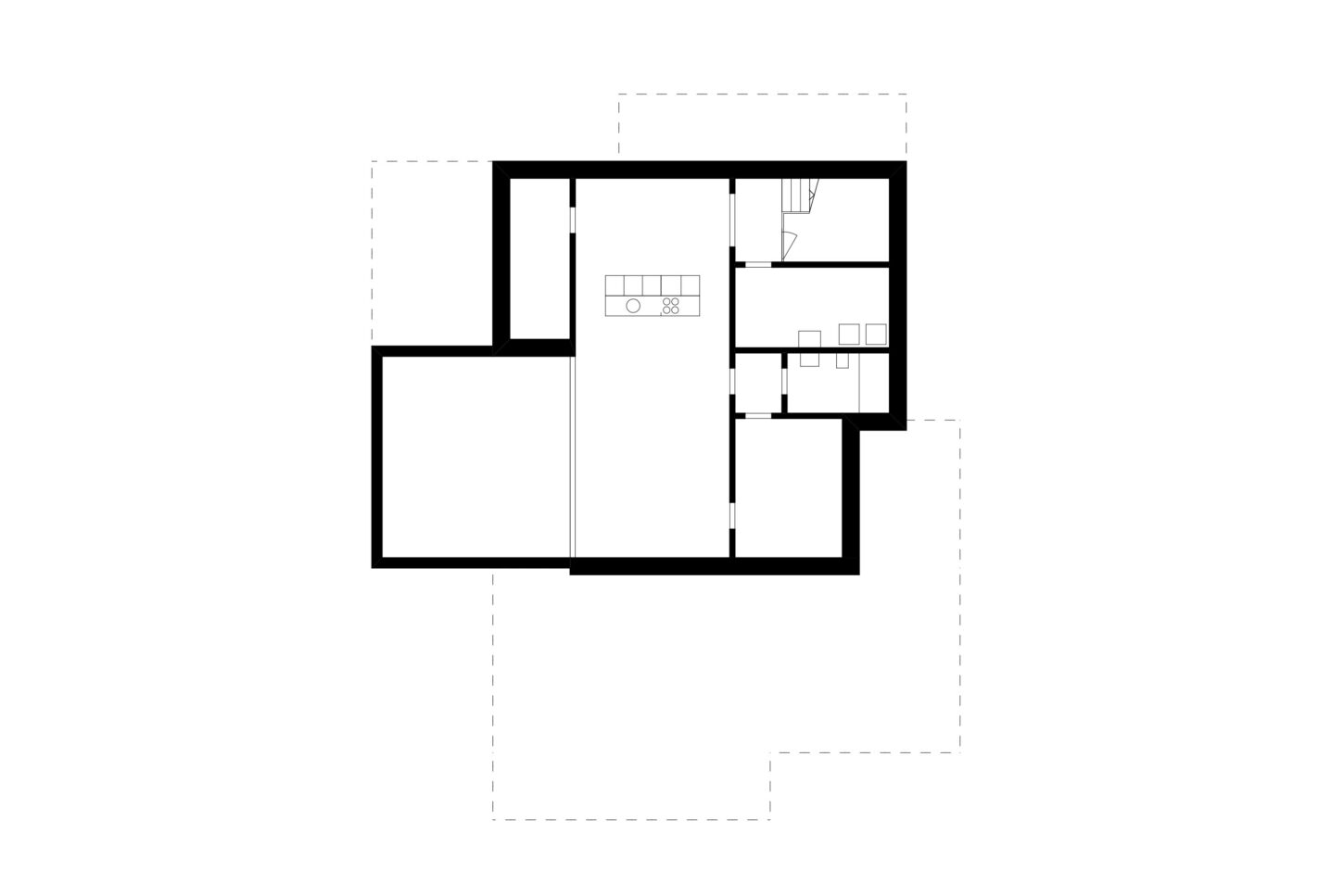 Im Zusammenspiel von Topografie und Bauvorschriften wurde ein Split-Level-Konzept erarbeitet, das jeweils drei Wohnungen versetzt anordnet. Im zentralen Treppenhaus werden die Wohnungen durch eine kontinuierliche Kaskadentreppe erschlossen. Während alle bedienten Räume gut belichtet an der Fassade angeordnet sind, wurden die dienenden Räume im Innern der Wohnung zusammengefasst. Alle Wohnungen sind voneinander weg gerichtet, jeweils dreiseitig orientiert und haben private, von den anderen Wohnungen nicht einsehbare Aussenräume. Das zusammenhängende Raumgefüge von Ess-Wohn-Loggia-Zimmer bietet Grosszügigkeit. Einerseits mit Durchblicken innerhalb der Wohnung und andererseits mit Sicht in die Umgebung. Durch Fassadenknicke entstehen im Raum Verengungen die zonieren und private Bereiche zum Rückziehen erlauben.