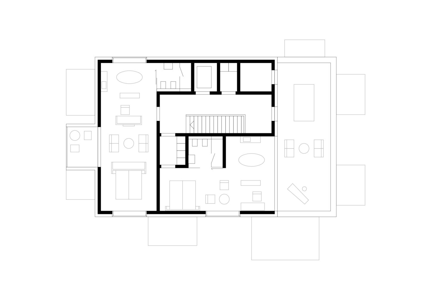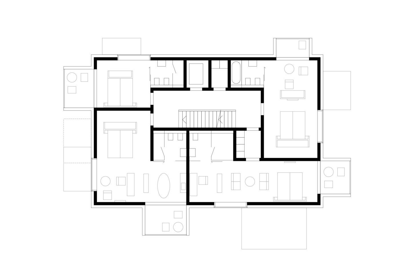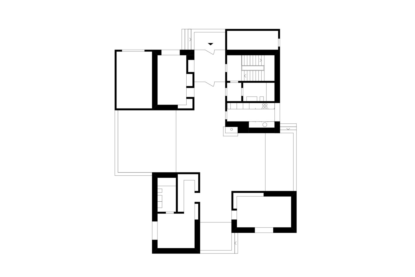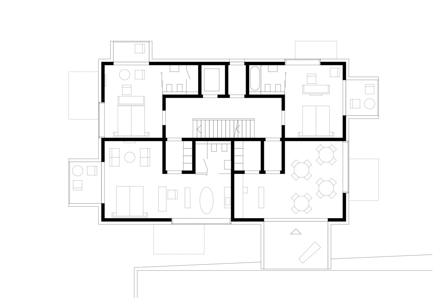 Im Zusammenspiel von Topografie und Bauvorschriften wurde ein Split-Level-Konzept erarbeitet, das jeweils drei Wohnungen versetzt anordnet. Im zentralen Treppenhaus werden die Wohnungen durch eine kontinuierliche Kaskadentreppe erschlossen. Während alle bedienten Räume gut belichtet an der Fassade angeordnet sind, wurden die dienenden Räume im Innern der Wohnung zusammengefasst. Alle Wohnungen sind voneinander weg gerichtet, jeweils dreiseitig orientiert und haben private, von den anderen Wohnungen nicht einsehbare Aussenräume. Das zusammenhängende Raumgefüge von Ess-Wohn-Loggia-Zimmer bietet Grosszügigkeit. Einerseits mit Durchblicken innerhalb der Wohnung und andererseits mit Sicht in die Umgebung. Durch Fassadenknicke entstehen im Raum Verengungen die zonieren und private Bereiche zum Rückziehen erlauben.