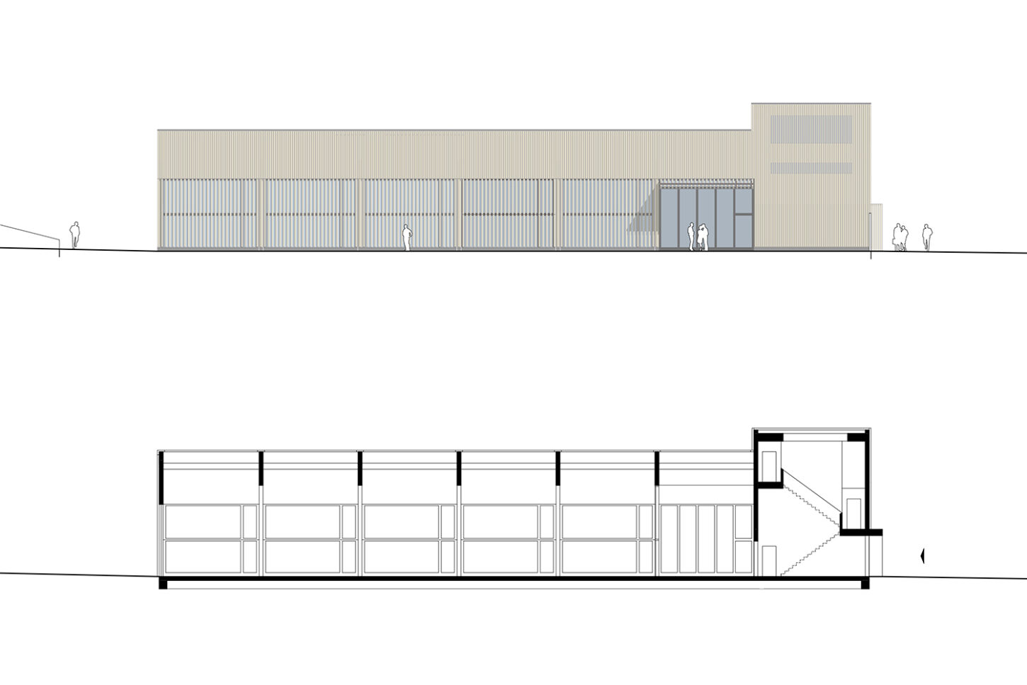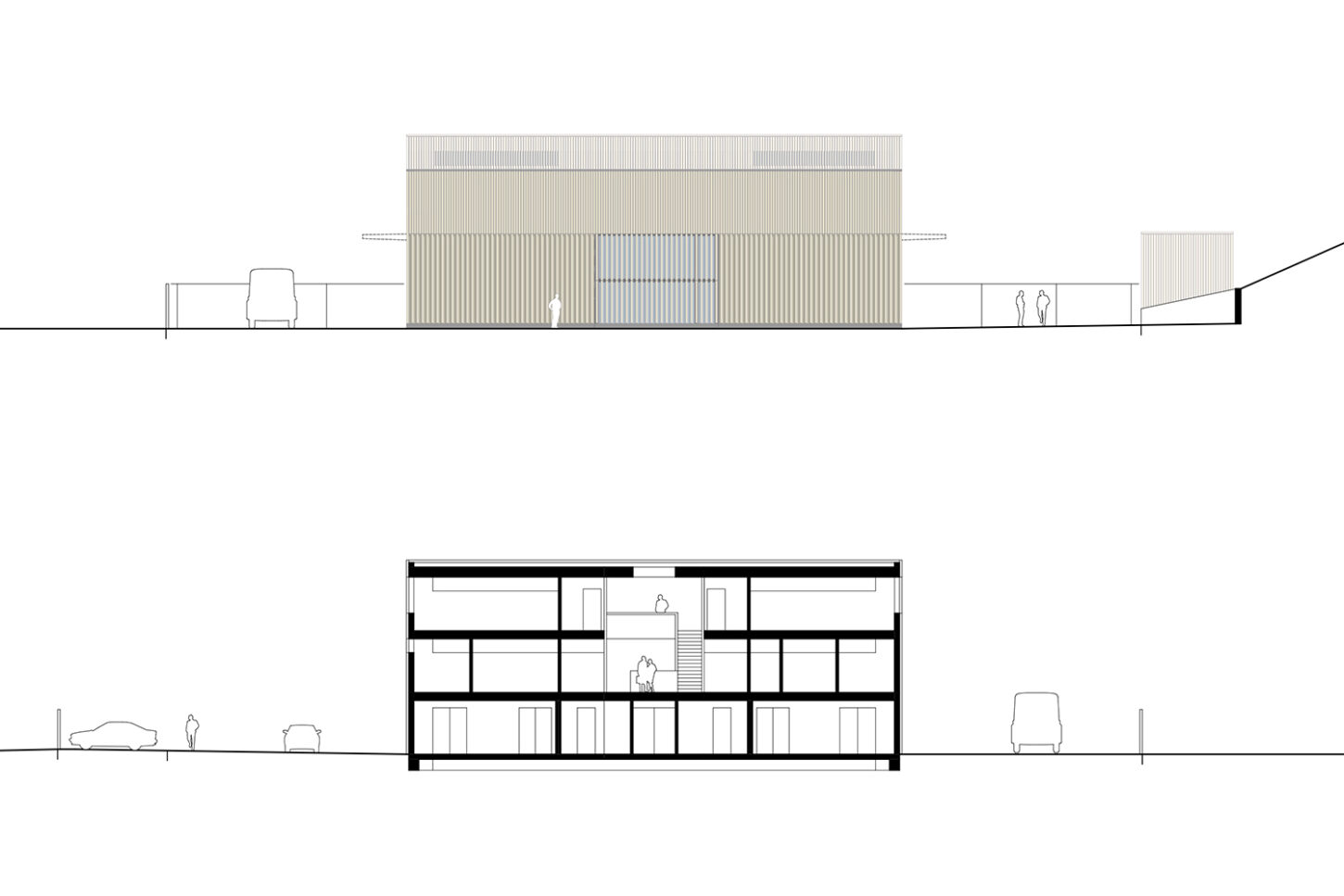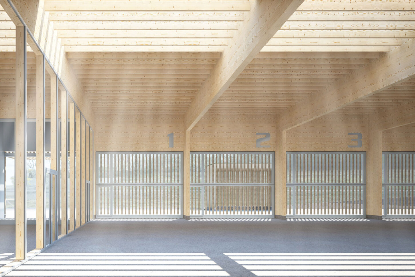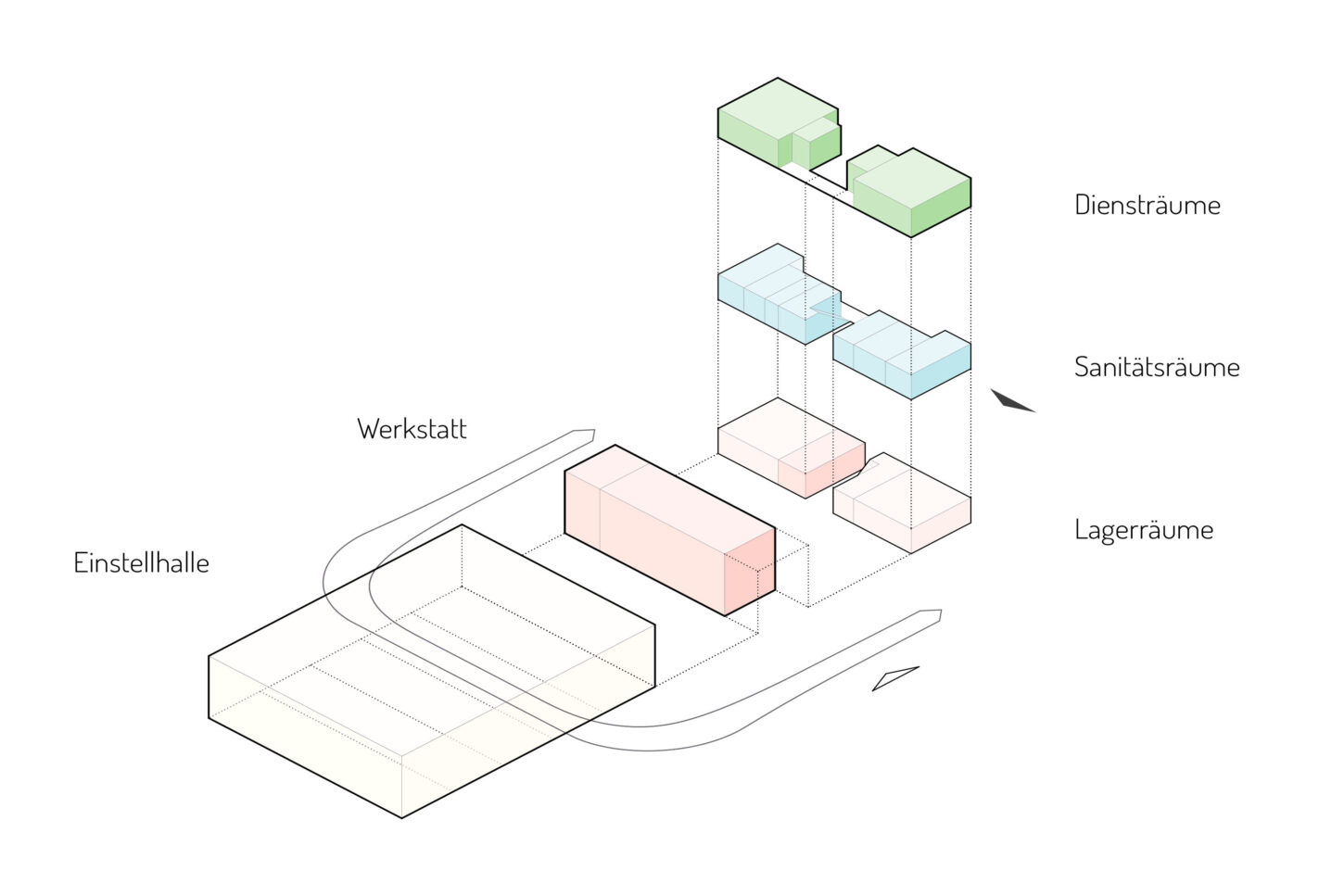 Das Volumen teilt sich in einen Hallenteil und einen leicht erhöhten Kopfbau mit Nebenräumen. Der Zugang erfolgt über den mittig gelegenen Treppenraum. Zenitales Licht erhellt den vertikalen Raum bis ins Erdgeschoss und führt den Blick in Richtung der grossen Halle – dem Herzstück des Gebäudes. Über die gegenläufige Treppe werden die oberen Diensträume erschlossen. Während im Zwischengeschoss die Sanitärräume für die Werkarbeiter angeordnet sind, liegen im Dachgeschoss die Büros der Administration. Die Einstellhalle im Durchfahrprinzip wird über das lange Lichtband belichtet, das die „symmetrische Mitte“ des Baus besetzt. Es entsteht ein einfacher durch Licht und Struktur geprägter Raum. In Anlehnung an einen „offenen Schopf“ wird der Holzbau durch eine Fassade mit vertikalen Kanthölzern strukturiert.