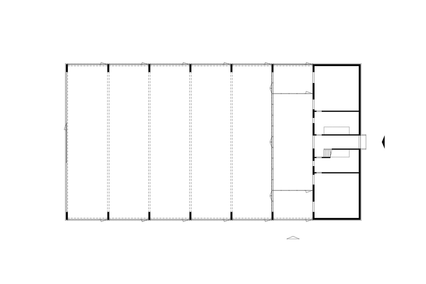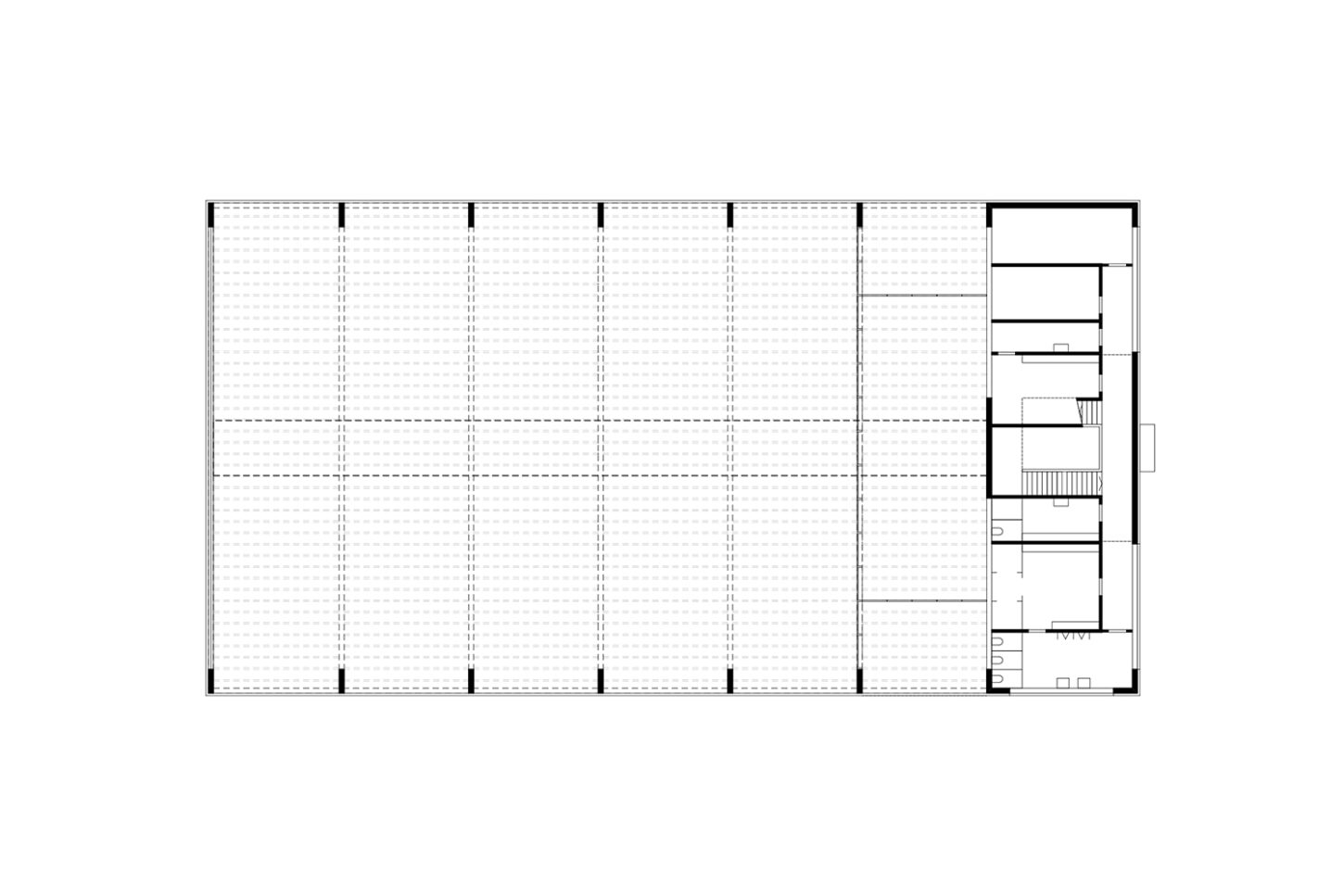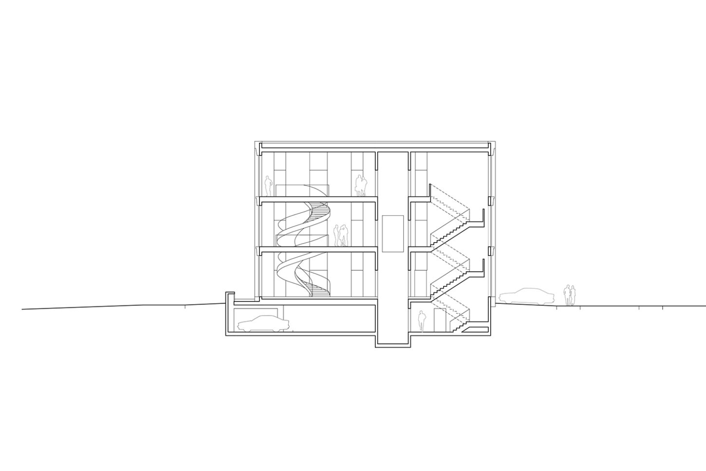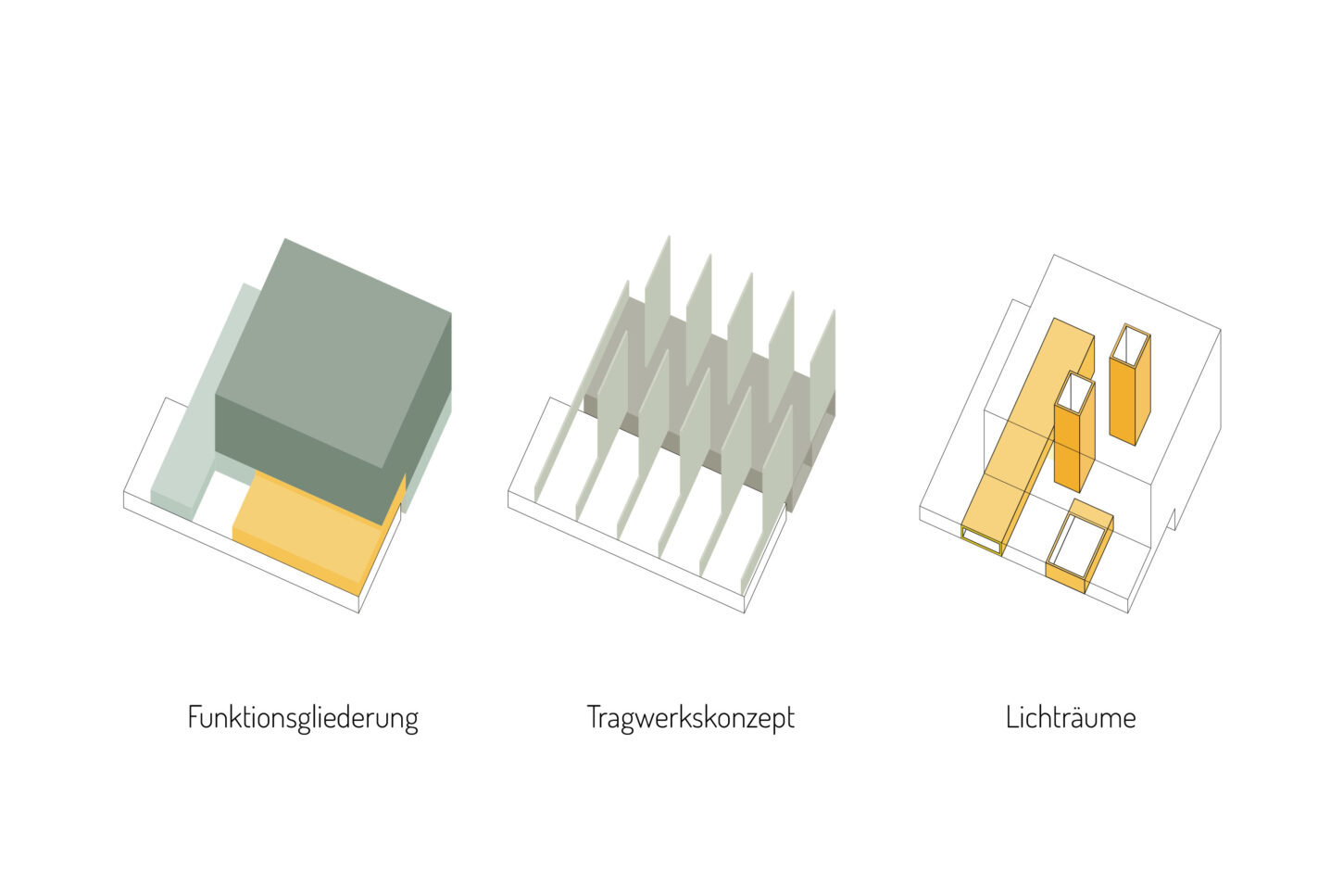 Das Volumen teilt sich in einen Hallenteil und einen leicht erhöhten Kopfbau mit Nebenräumen. Der Zugang erfolgt über den mittig gelegenen Treppenraum. Zenitales Licht erhellt den vertikalen Raum bis ins Erdgeschoss und führt den Blick in Richtung der grossen Halle – dem Herzstück des Gebäudes. Über die gegenläufige Treppe werden die oberen Diensträume erschlossen. Während im Zwischengeschoss die Sanitärräume für die Werkarbeiter angeordnet sind, liegen im Dachgeschoss die Büros der Administration. Die Einstellhalle im Durchfahrprinzip wird über das lange Lichtband belichtet, das die „symmetrische Mitte“ des Baus besetzt. Es entsteht ein einfacher durch Licht und Struktur geprägter Raum. In Anlehnung an einen „offenen Schopf“ wird der Holzbau durch eine Fassade mit vertikalen Kanthölzern strukturiert.