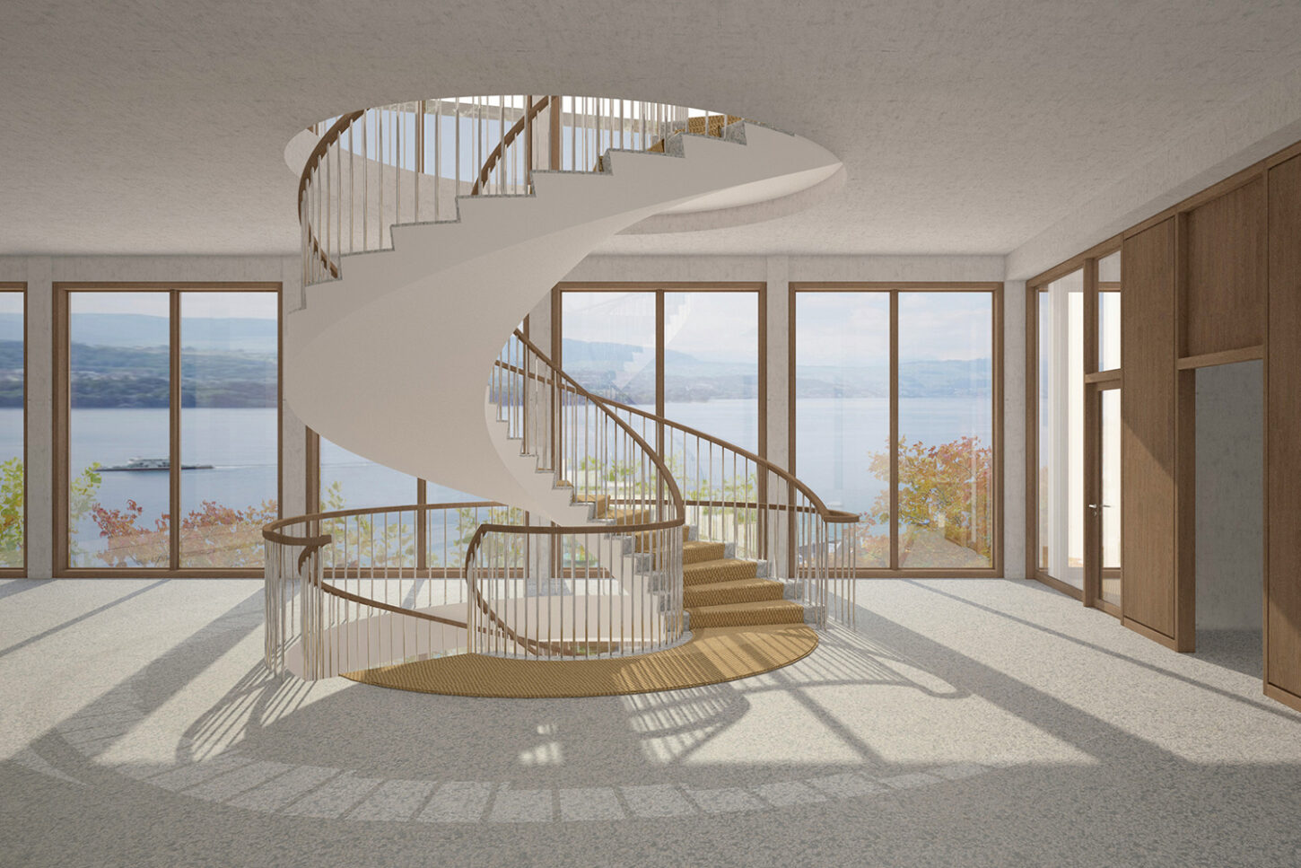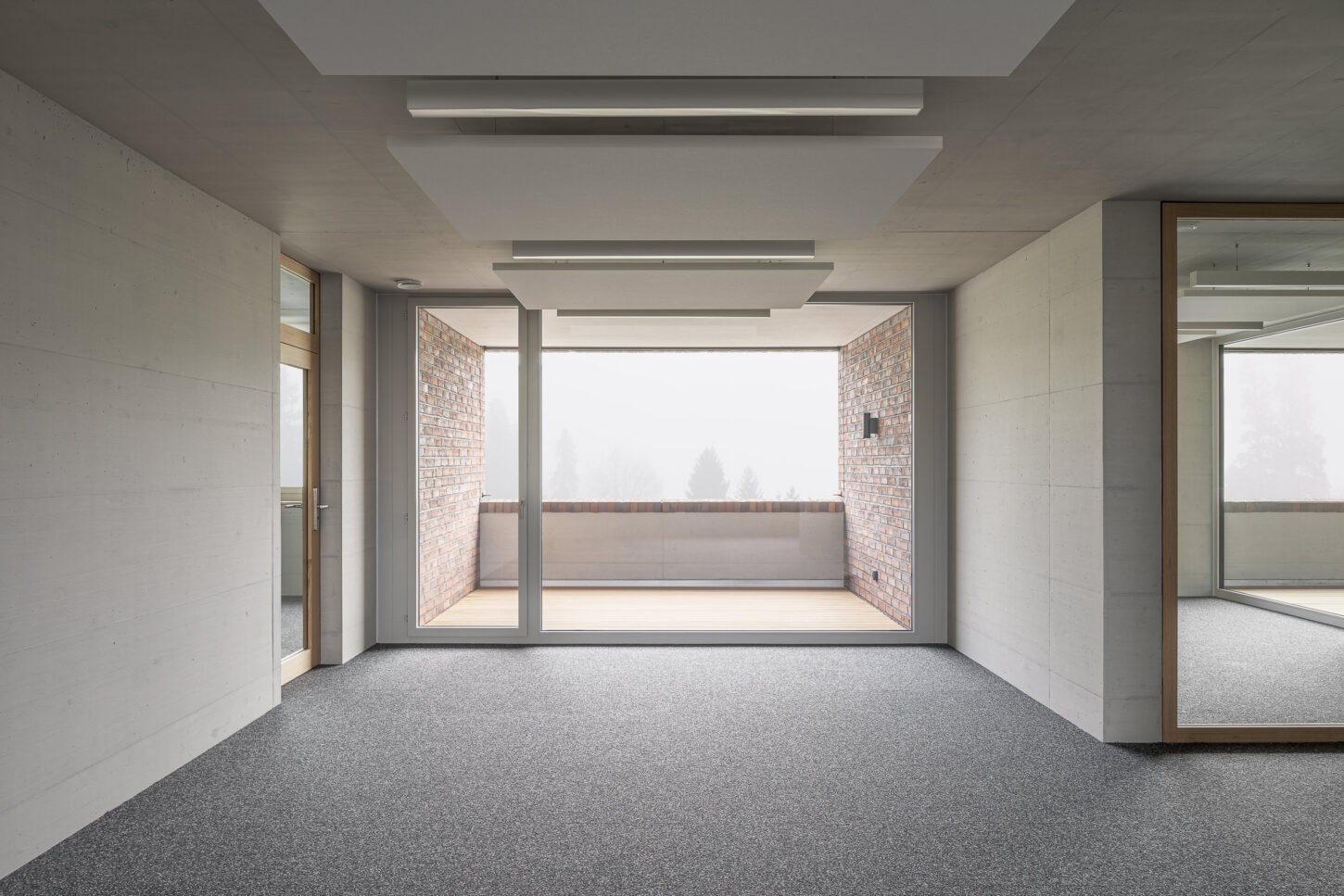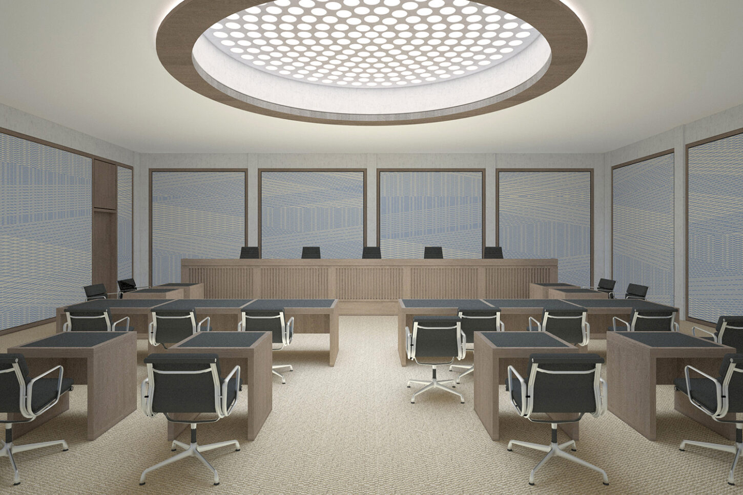 Während im Erdgeschoss die Räume für den sicheren Gebäudezutritt platziert sind, liegen in den beiden Obergeschossen vier unterschiedliche Gerichtssäle mit Sitzungs- und Nebenräumen. Die Vorzone mit der grossen Wendeltreppe erlaubt den Blick bis zur Hügelkette des Zimmerbergs. Die Grundrissstruktur teilt sich in eine öffentliche und eine gesicherte Zone. Sie ist Abbild der komplexen funktionalen Anforderungen. Im Innern soll durch eine warme Materialisierung eine ruhige und angenehme Atmosphäre geschaffen werden, die sich auf die Nutzer überträgt und das Vertrauen in die Rechtsprechung fördert. Für die Wandverkleidungen und die Vorhänge werden handgewebte Stoffe erstellt. Die grossflächigen Textilien wirken als einzelne Zeichnungen und binden die Gerichtssäle als Ganzes zusammen. Die Muster zeigen sich je nach Standpunkt unterschiedlich. Von nah scheinen sie chaotisch aber konkret, von fern offenbaren sie ihre Ordnung und ihre Bilder: abstrakte Landschaften aus sich kreuzenden interferierender Linien.