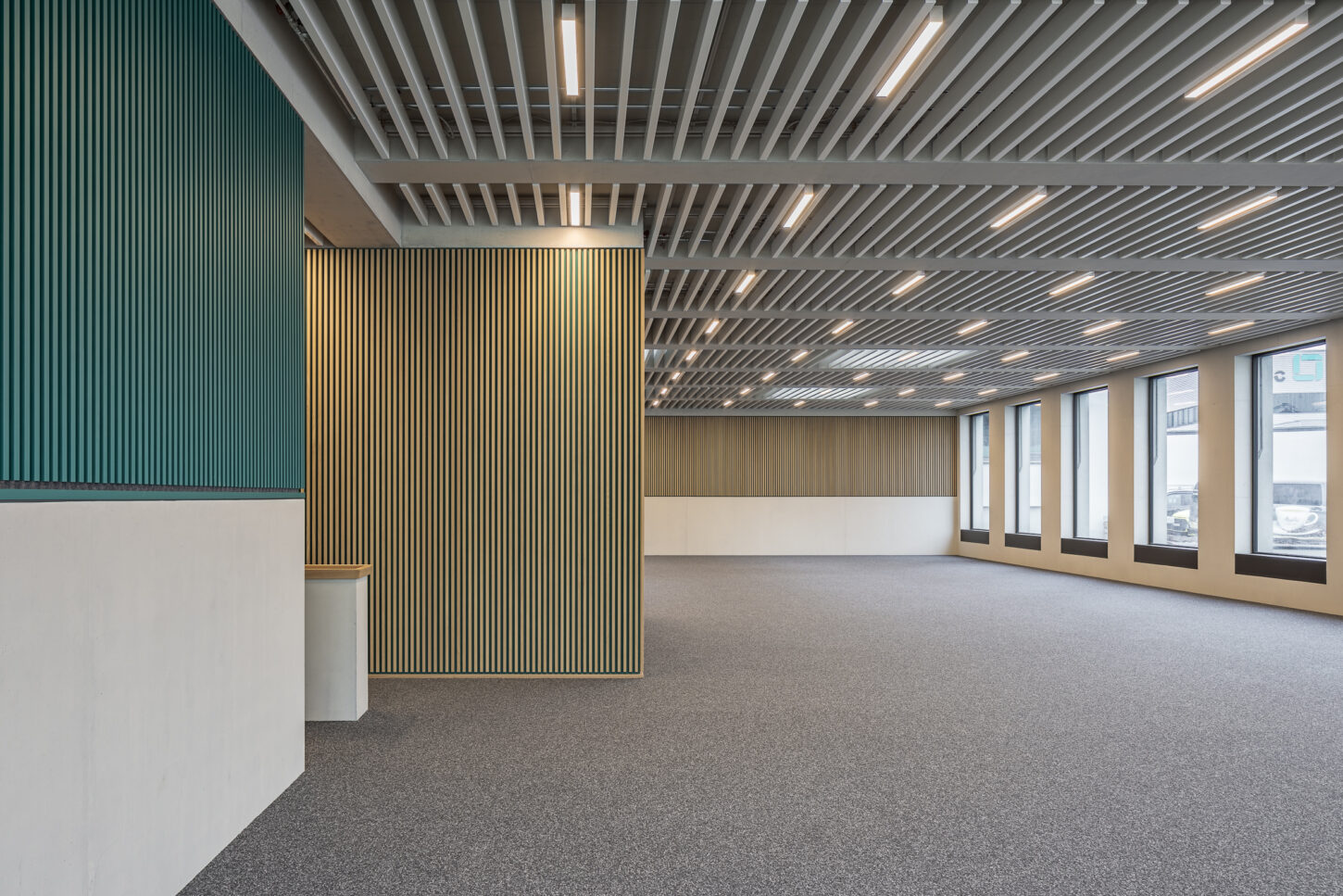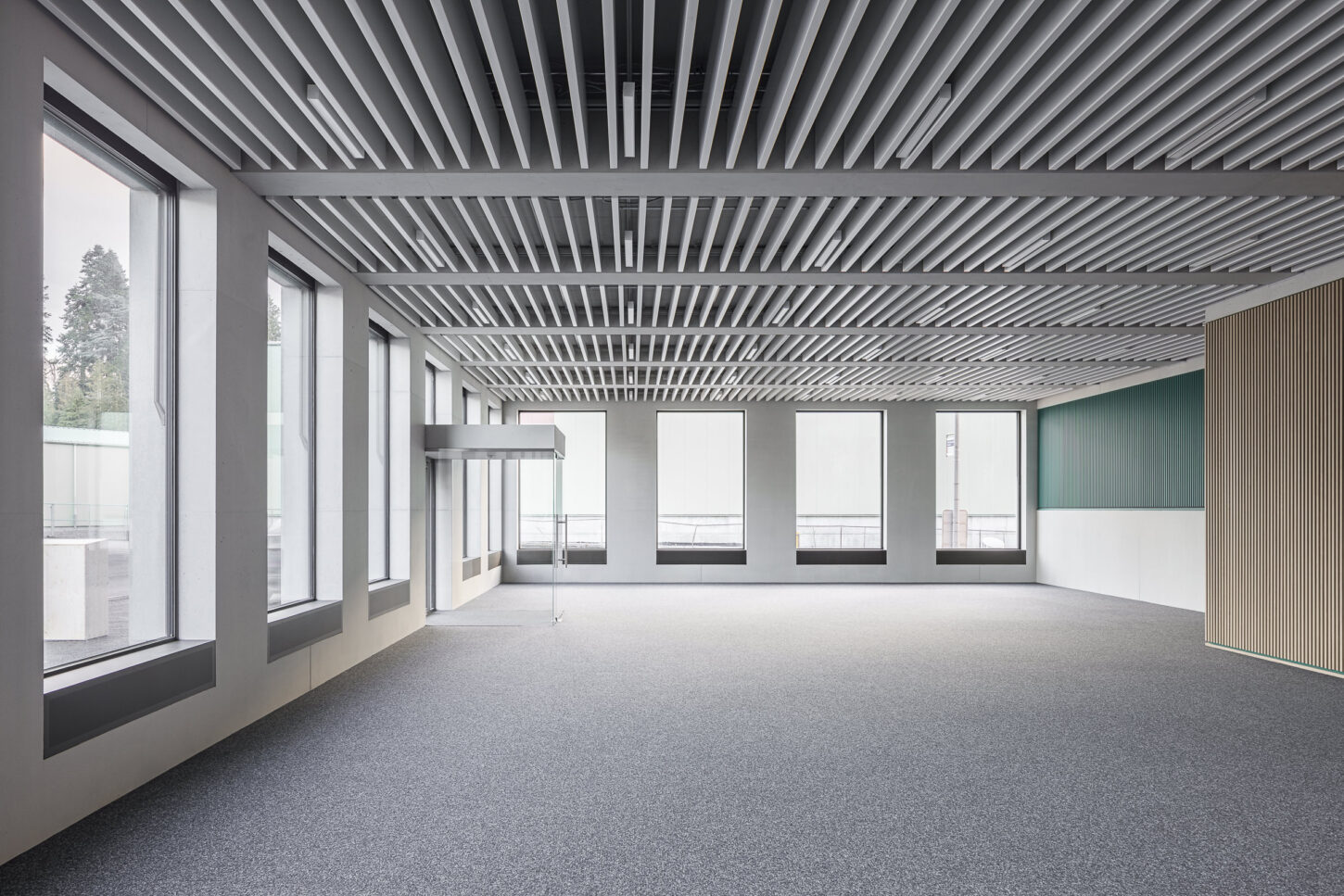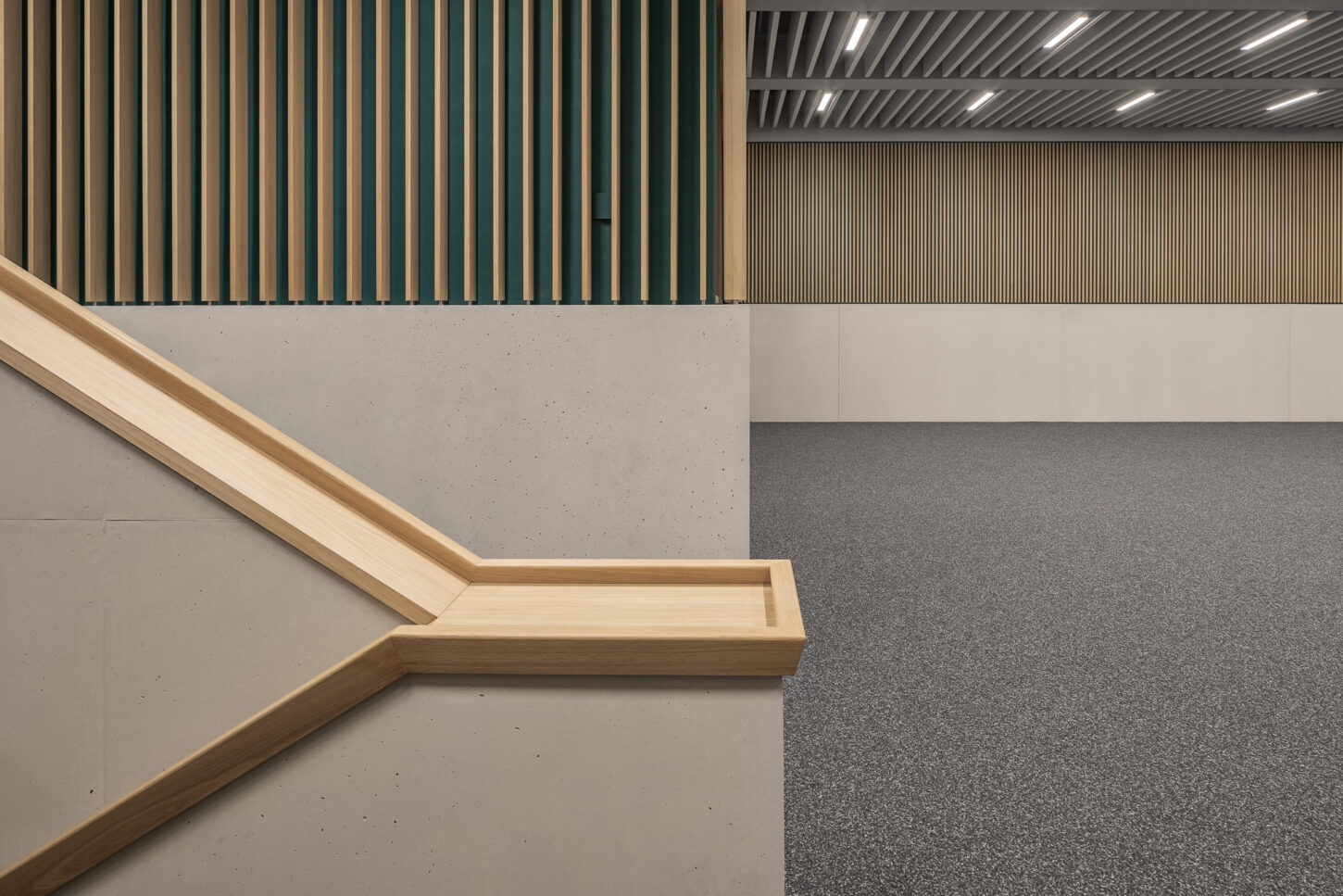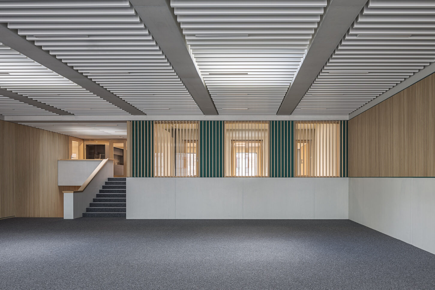 In den unteren beiden halböffentlichen Geschossen fügen sich die Arbeitsflächen, Mensa und Konferenzraum zu einem Kontinuum mit vielfältigen Ein- und Ausblicken zusammen. Der Sichtbeton wird durch Akustikverkleidungen aus Eiche und grüner Firmenfarbe ergänzt. Die weisse Baffeldecke sorgt nicht nur für Kühlung, sondern lässt durch ihre Zwischenräume auch sanftes, natürliches Licht einfallen.