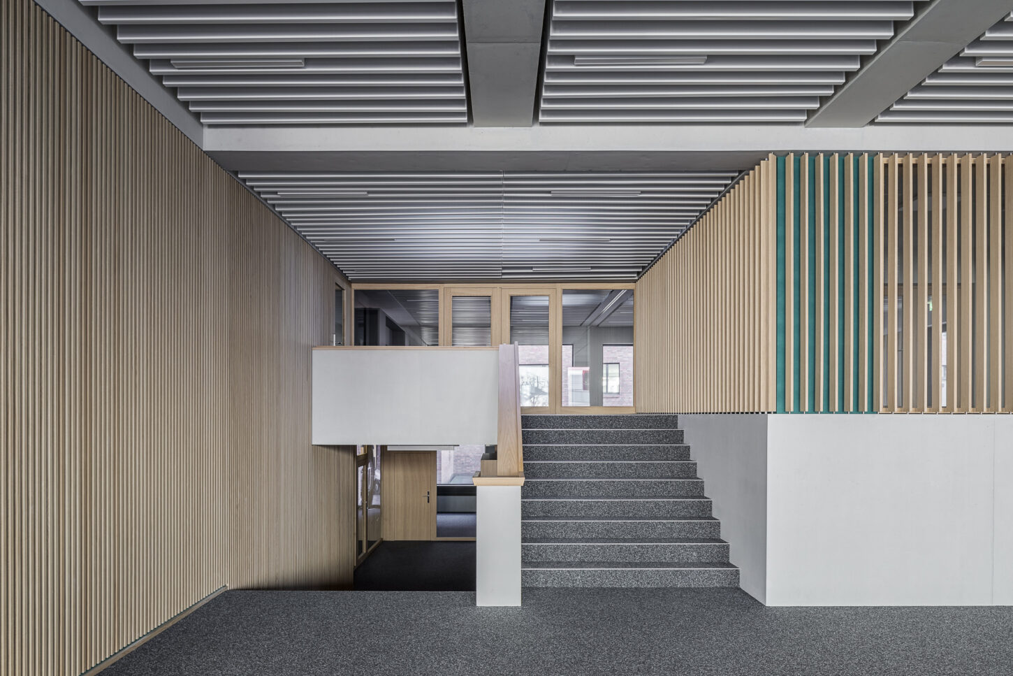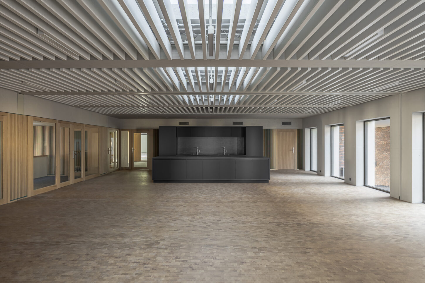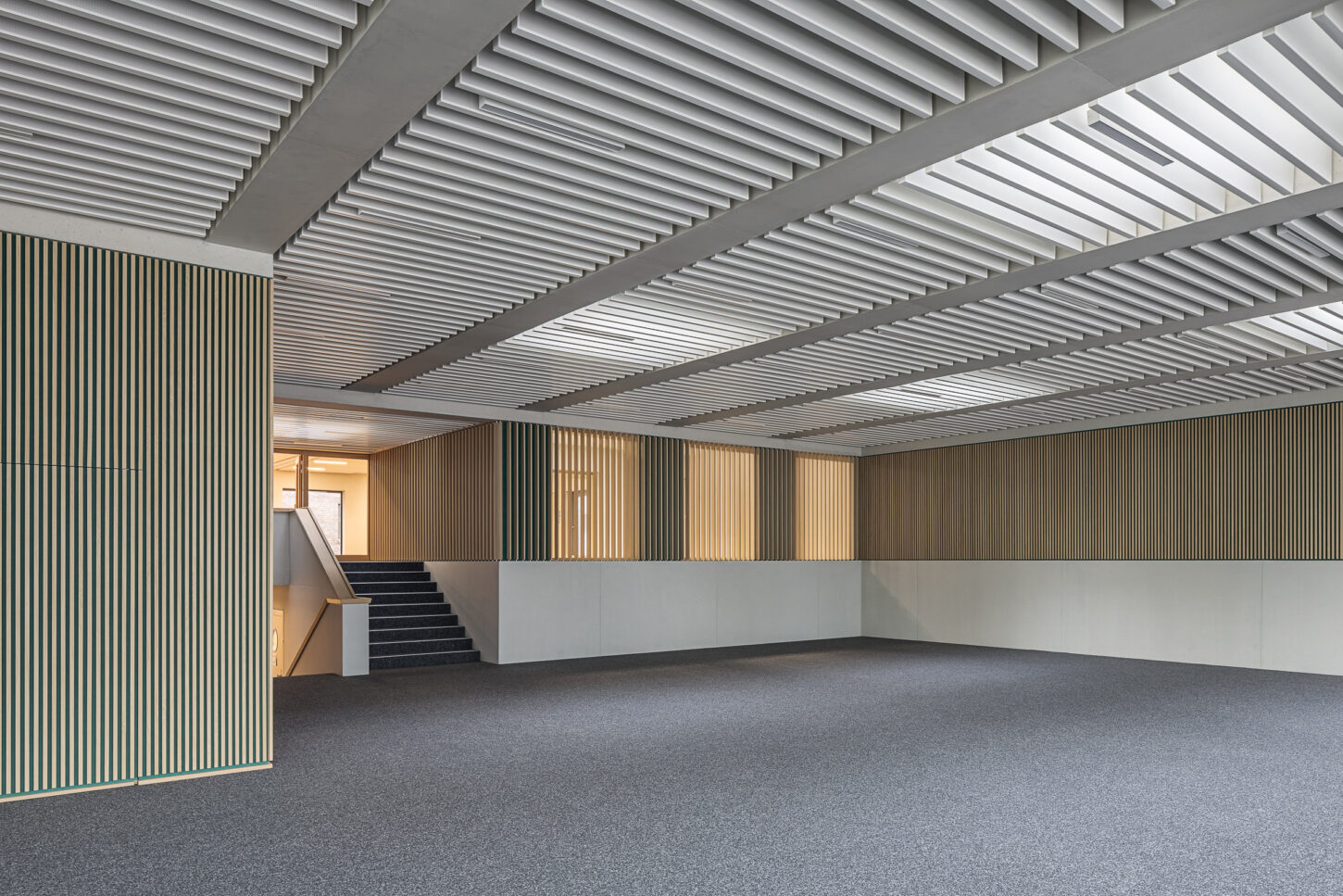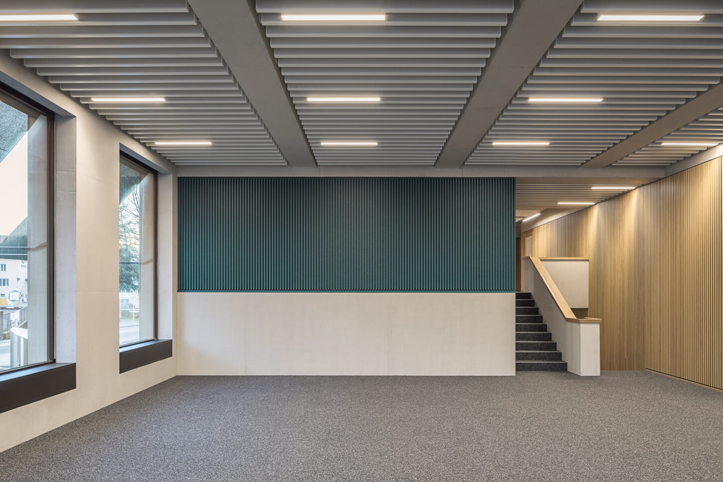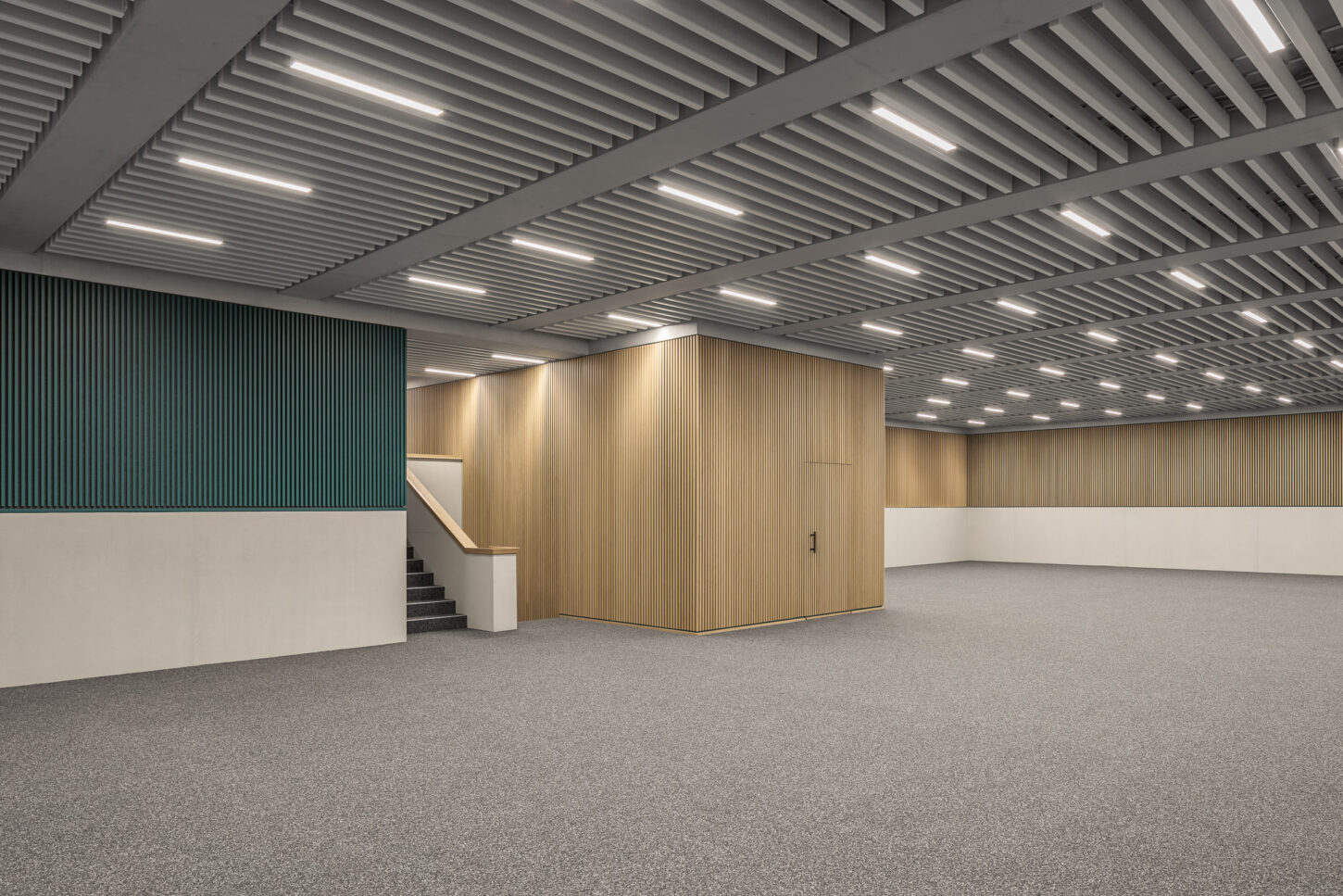 In den unteren beiden halböffentlichen Geschossen fügen sich die Arbeitsflächen, Mensa und Konferenzraum zu einem Kontinuum mit vielfältigen Ein- und Ausblicken zusammen. Der Sichtbeton wird durch Akustikverkleidungen aus Eiche und grüner Firmenfarbe ergänzt. Die weisse Baffeldecke sorgt nicht nur für Kühlung, sondern lässt durch ihre Zwischenräume auch sanftes, natürliches Licht einfallen.