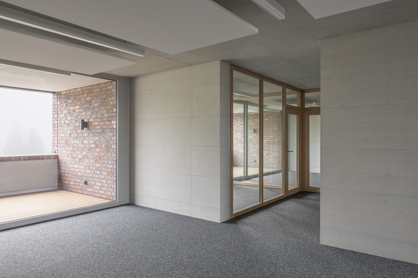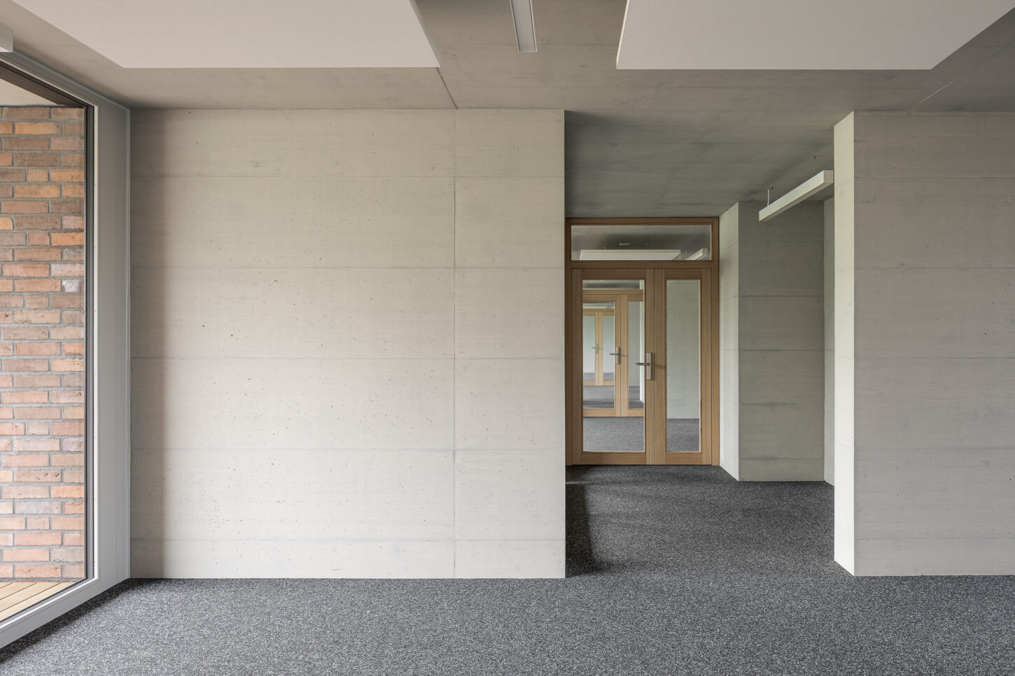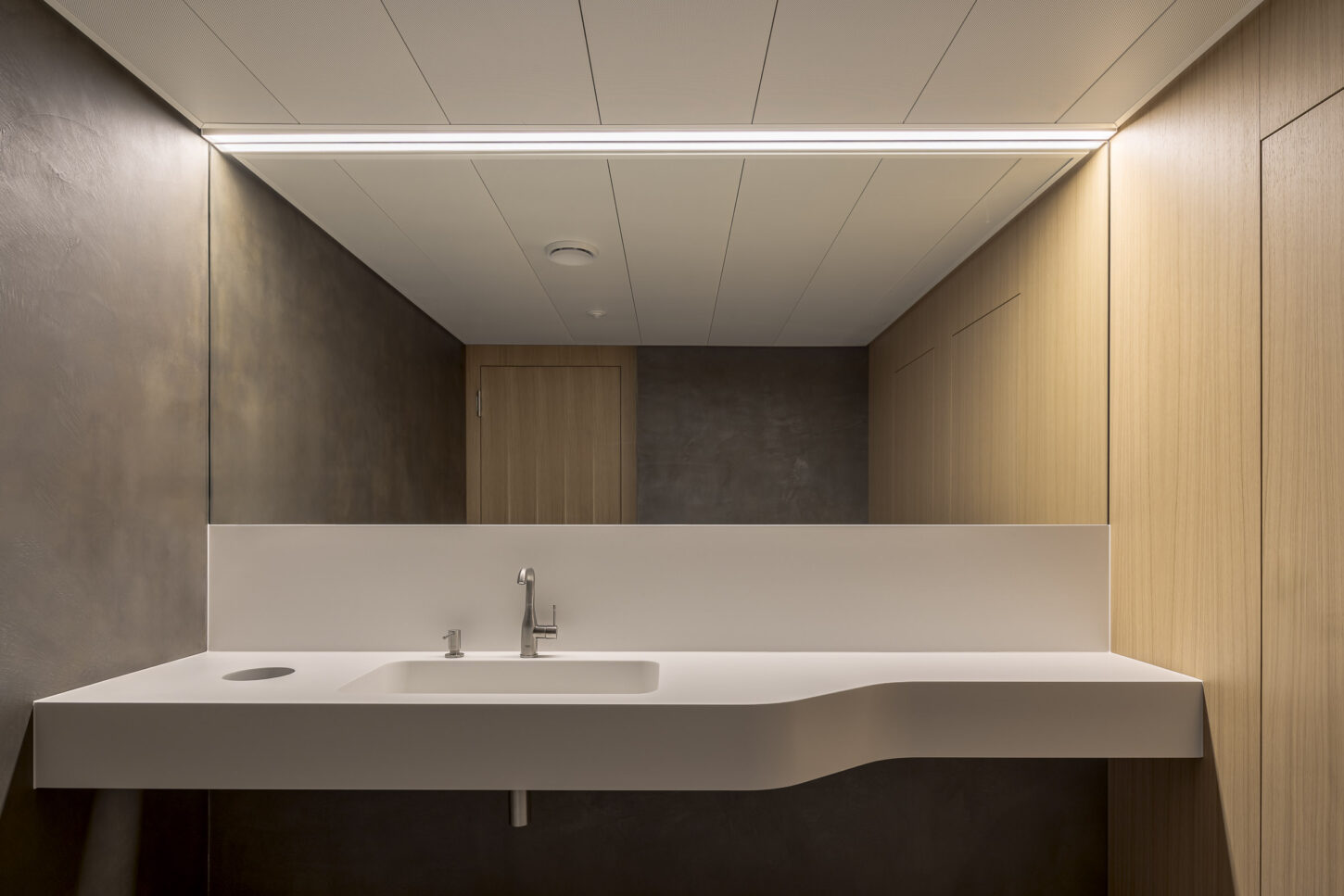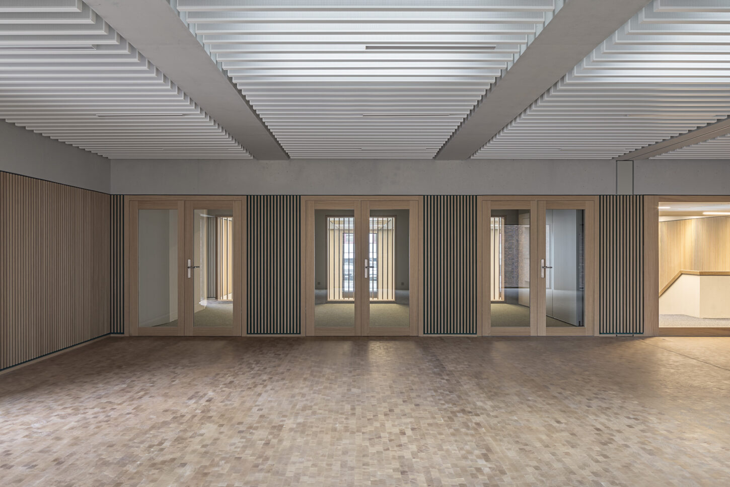 In den unteren beiden halböffentlichen Geschossen fügen sich die Arbeitsflächen, Mensa und Konferenzraum zu einem Kontinuum mit vielfältigen Ein- und Ausblicken zusammen. Der Sichtbeton wird durch Akustikverkleidungen aus Eiche und grüner Firmenfarbe ergänzt. Die weisse Baffeldecke sorgt nicht nur für Kühlung, sondern lässt durch ihre Zwischenräume auch sanftes, natürliches Licht einfallen.