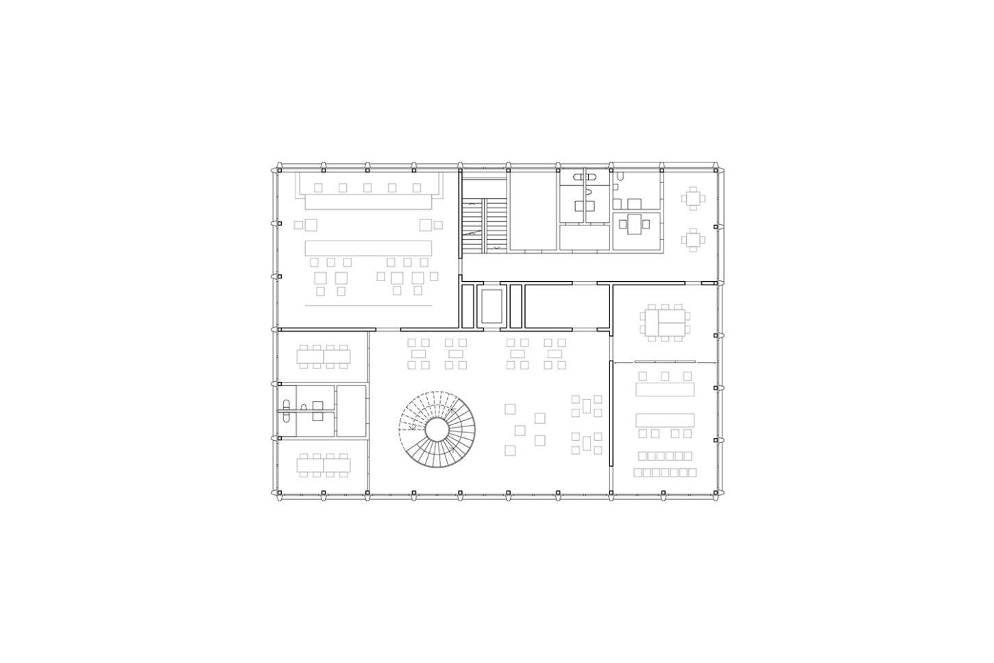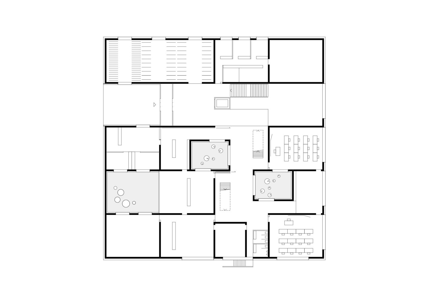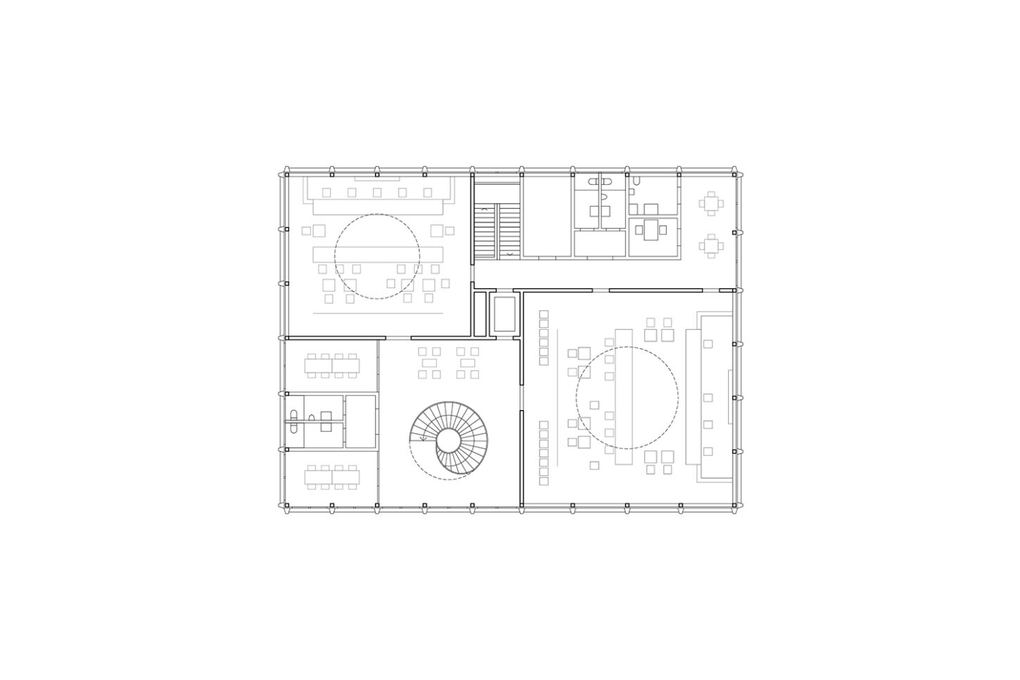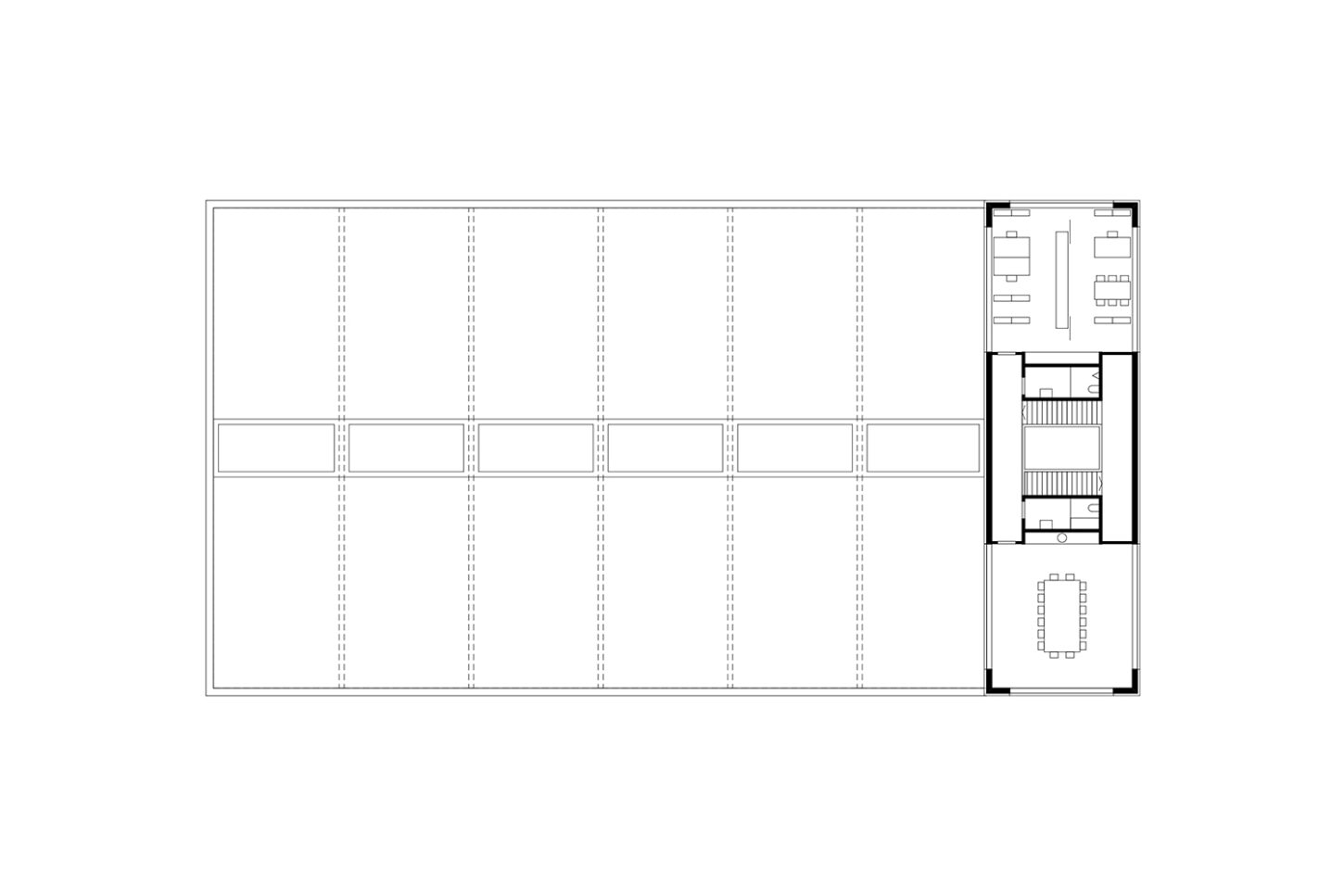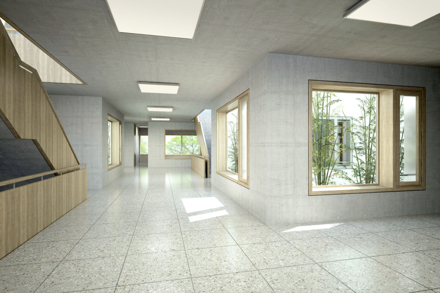 In den unteren beiden halböffentlichen Geschossen fügen sich die Arbeitsflächen, Mensa und Konferenzraum zu einem Kontinuum mit vielfältigen Ein- und Ausblicken zusammen. Der Sichtbeton wird durch Akustikverkleidungen aus Eiche und grüner Firmenfarbe ergänzt. Die weisse Baffeldecke sorgt nicht nur für Kühlung, sondern lässt durch ihre Zwischenräume auch sanftes, natürliches Licht einfallen.