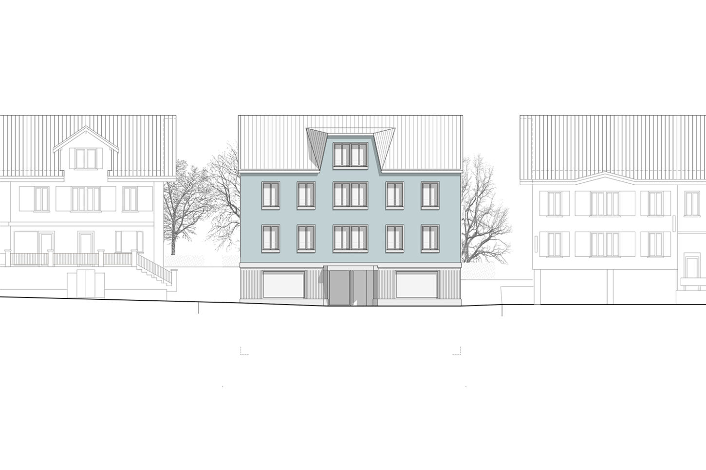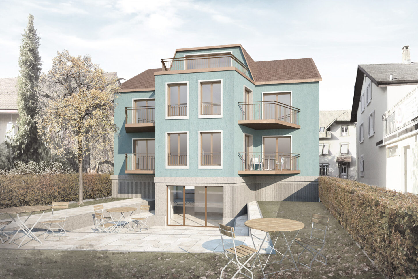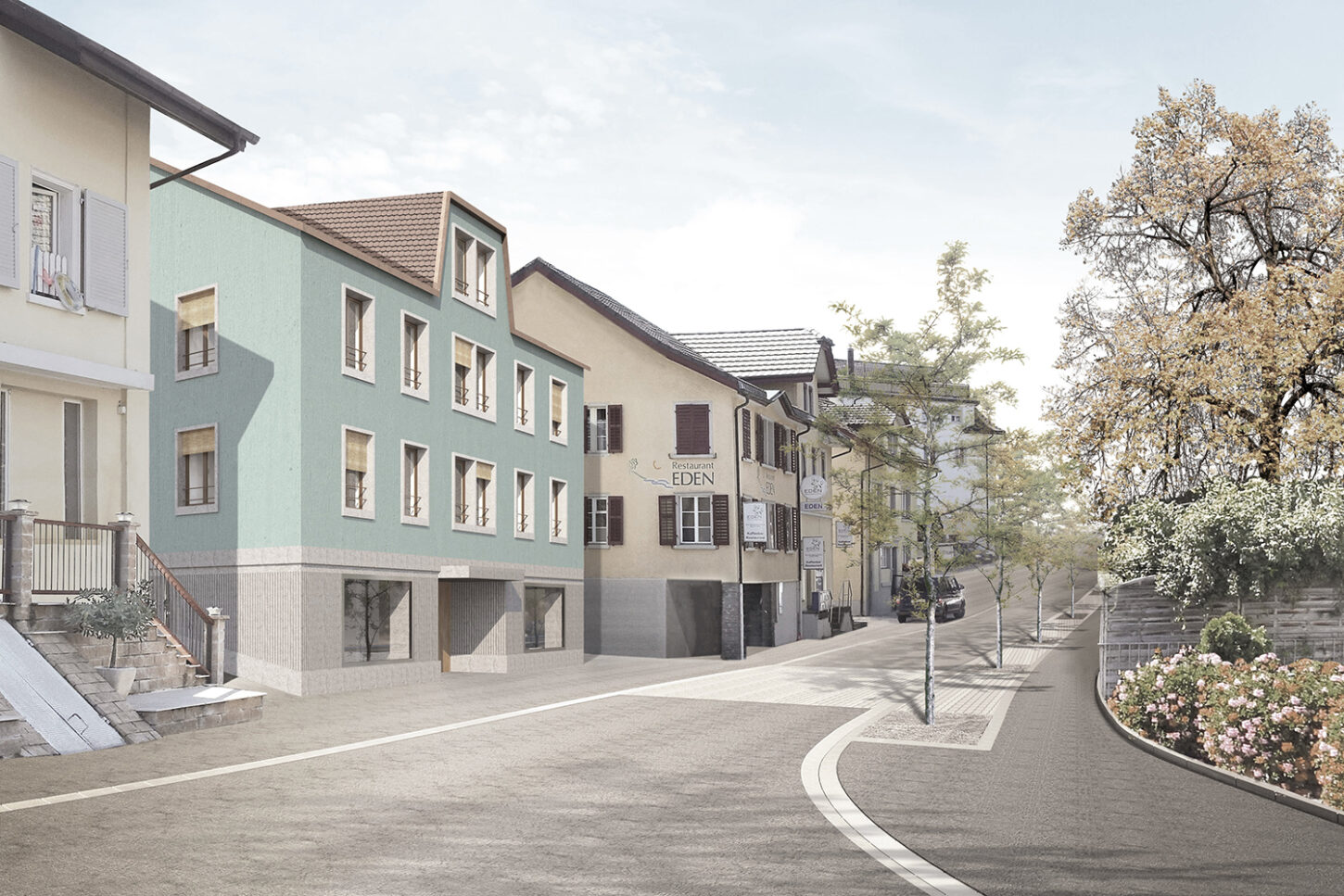 Der Ausdruck orientiert sich an den vorhandenen Typologien im heutigen Strassenraum. Das Dach hat Trauf- und Firstlinien die parallel zur Strasse verlaufen. Die symmetrische Fassade teilt sich in einen massiven Sockel und eine darüber liegende verputzte Lochfassade. Die grossen Schaufenster bereichern den Strassenraum und laden zum Verweilen ein. Die Fenster im Obergeschoss haben ortsübliche Proportionen. Diese sind mit Betongewänden umrahmt und mit Rollläden beschattet. Gartenseitig wird die Grünfläche grosszügig beibehalten. Eine Terrassierung lässt viel Licht von der Südseite ins Erdgeschoss. Dies erzeugt eine räumliche Verbindung zwischen Strasse und Garten. Über diesem Gartenhof stösst in den oberen Stockwerken ein raumerweiternder Risalit ins Grün. Die Dachterrasse und die seitlichen Balkone lassen den Garten auch in den Obergeschossen erleben. Das Haus soll in solidem Handwerk und mit beständigen Oberflächen gebaut werden. Der Verputz erhält einen Anstrich in grauem Petrol-Mint, der die bereits vorhandene Farbenvielfalt im Strassenraum ergänzt.
