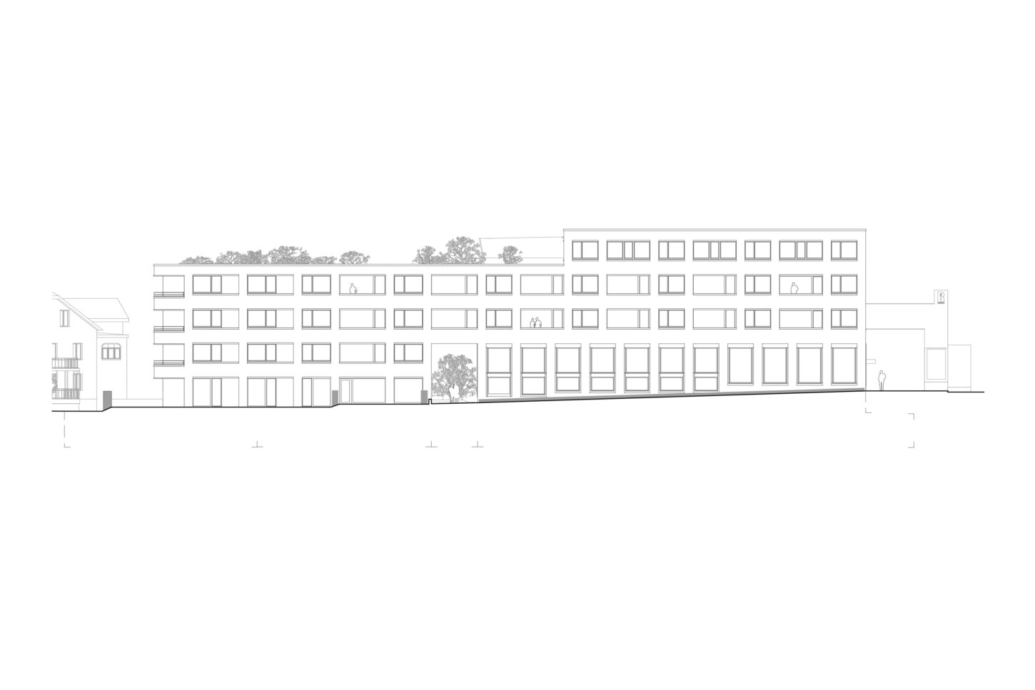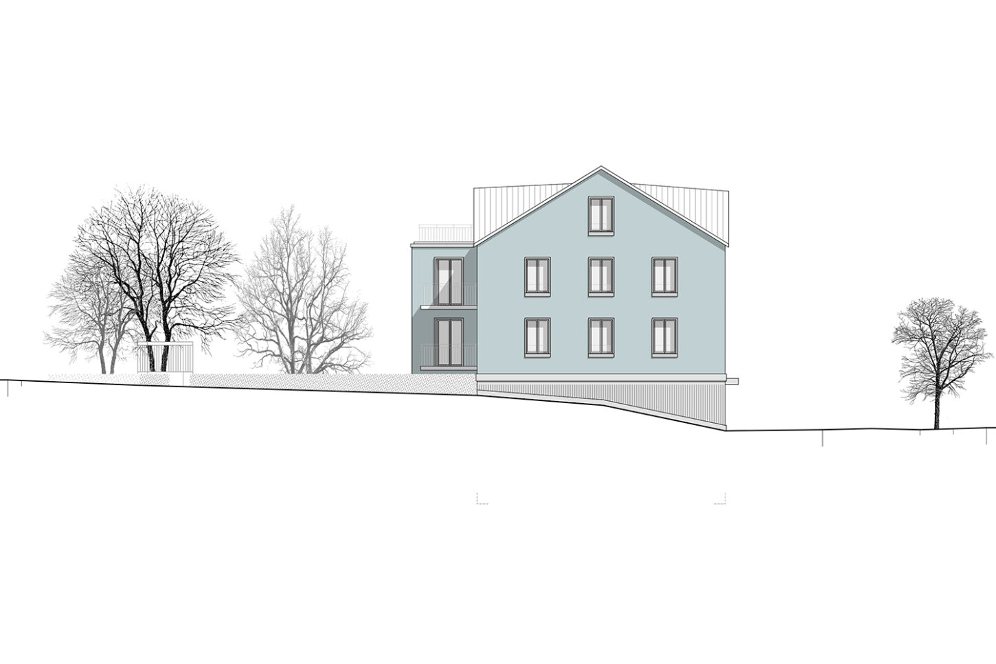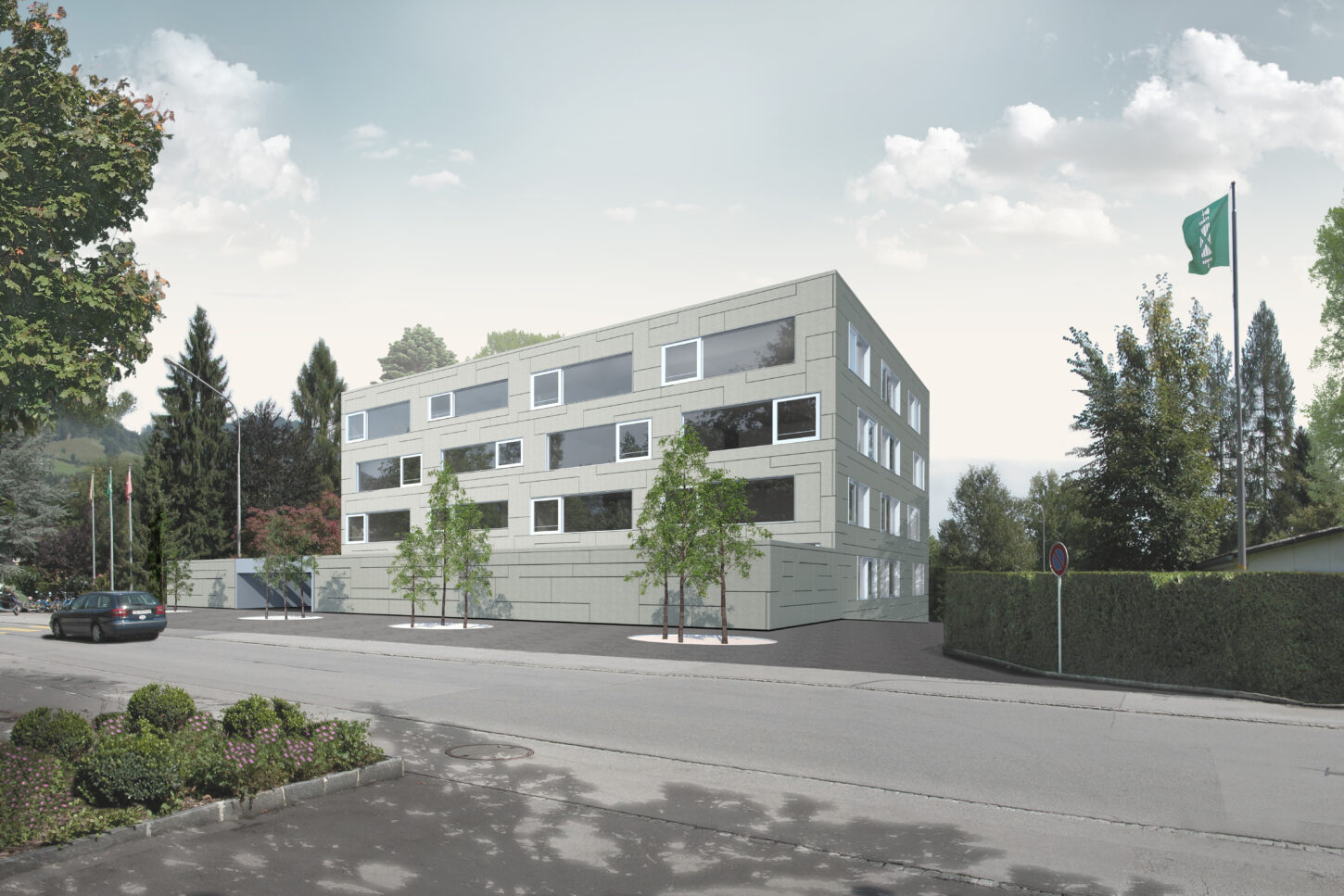 Der Ausdruck orientiert sich an den vorhandenen Typologien im heutigen Strassenraum. Das Dach hat Trauf- und Firstlinien die parallel zur Strasse verlaufen. Die symmetrische Fassade teilt sich in einen massiven Sockel und eine darüber liegende verputzte Lochfassade. Die grossen Schaufenster bereichern den Strassenraum und laden zum Verweilen ein. Die Fenster im Obergeschoss haben ortsübliche Proportionen. Diese sind mit Betongewänden umrahmt und mit Rollläden beschattet. Gartenseitig wird die Grünfläche grosszügig beibehalten. Eine Terrassierung lässt viel Licht von der Südseite ins Erdgeschoss. Dies erzeugt eine räumliche Verbindung zwischen Strasse und Garten. Über diesem Gartenhof stösst in den oberen Stockwerken ein raumerweiternder Risalit ins Grün. Die Dachterrasse und die seitlichen Balkone lassen den Garten auch in den Obergeschossen erleben. Das Haus soll in solidem Handwerk und mit beständigen Oberflächen gebaut werden. Der Verputz erhält einen Anstrich in grauem Petrol-Mint, der die bereits vorhandene Farbenvielfalt im Strassenraum ergänzt.