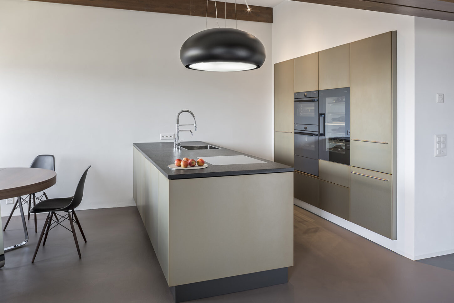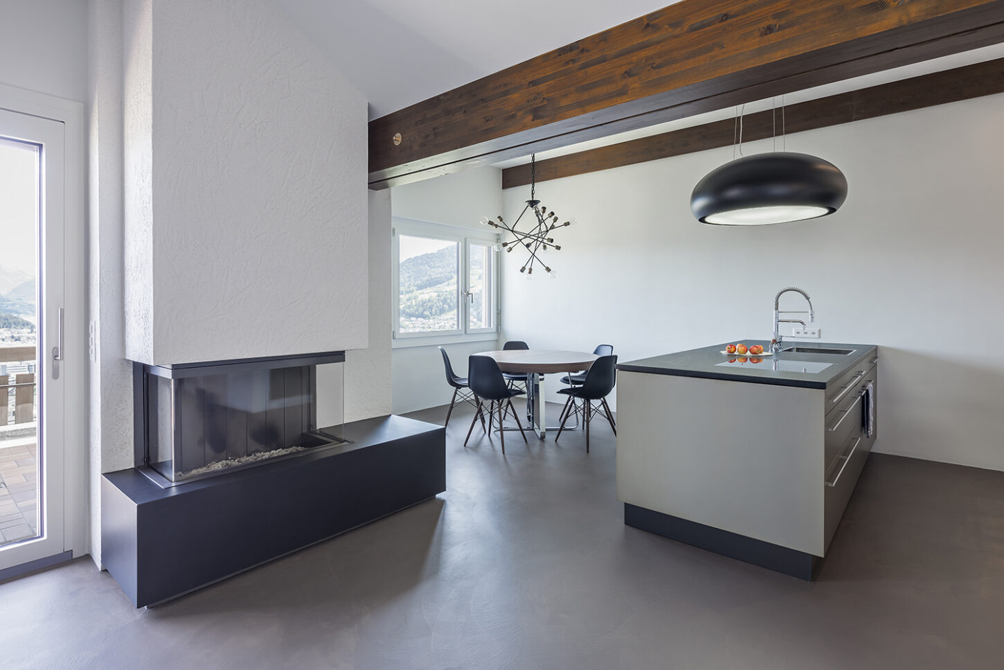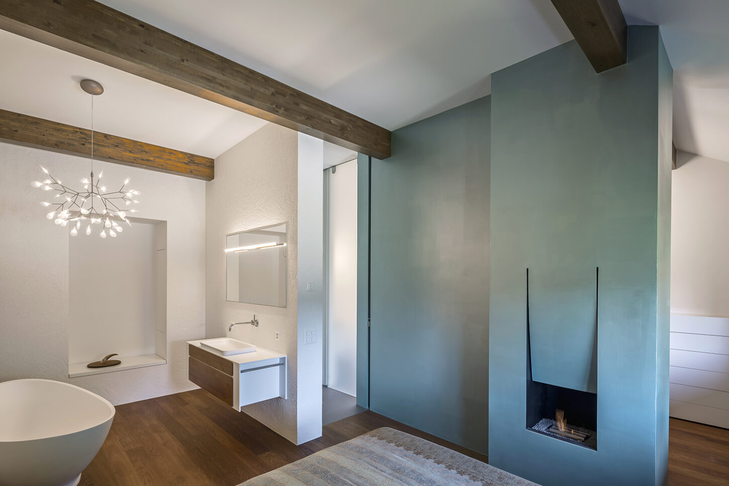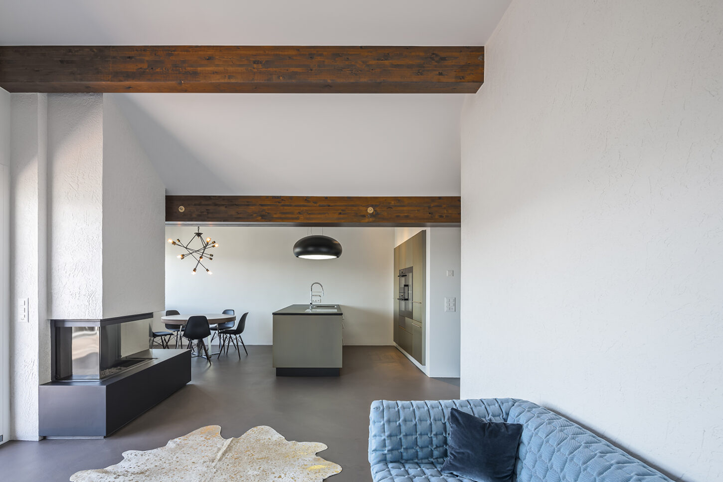 Die kleinen Zimmer und Nassräume entsprachen nicht mehr den heutigen Anforderungen. Sie waren für ein Wohnen im Alter ungeeignet. Die charakteristischen Merkmale der Wohnung sind das gefaltete Dach mit dunklen Balken und die abgerundeten Wände. Mit gezielten Wanddurchbrüchen wurde die kleinteilige Struktur aufgebrochen und in eine grosszügige zusammenhängende Raumabfolge verwandelt. Die raumhohen Schiebetüren unterstützen den Effekt des durchlässigen Raumes und machen das gefaltete Dach erlebbar. Während die Dachuntersicht und die Aussenwände neu mit einem Glattputz versehen wurden, sind die inneren Wandflächen mit unterschiedlichen Putzstrukturen und Zuschlagstoffen gestaltet. Die dunklen Holzbalken binden die Wohnung über alle Räume hinweg, zu einem neuen Ganzen zusammen.