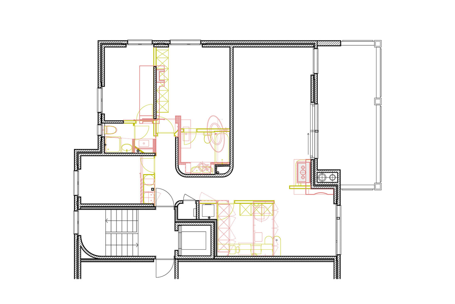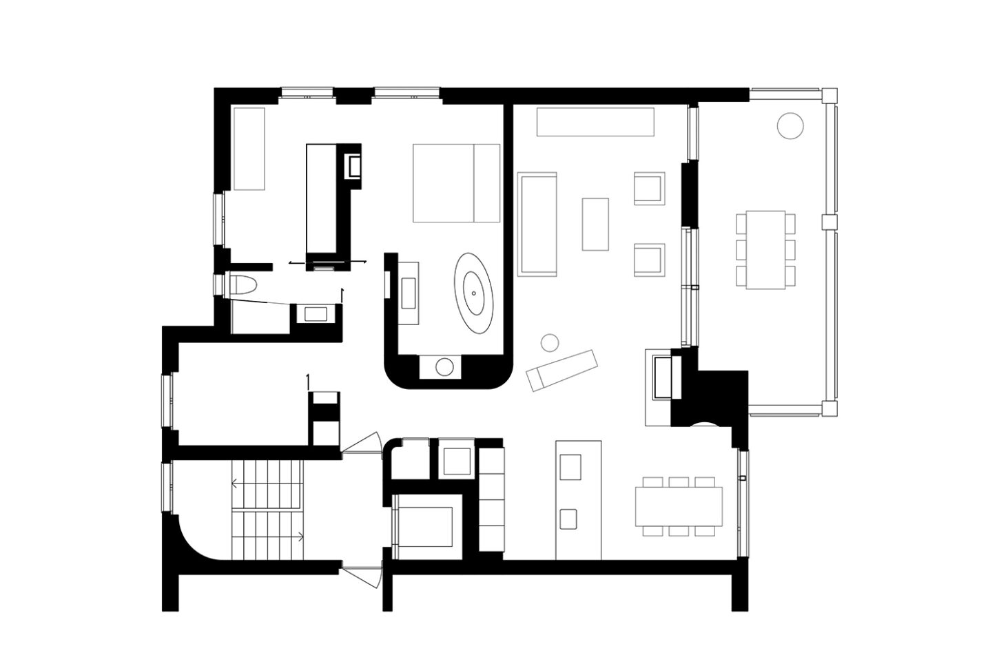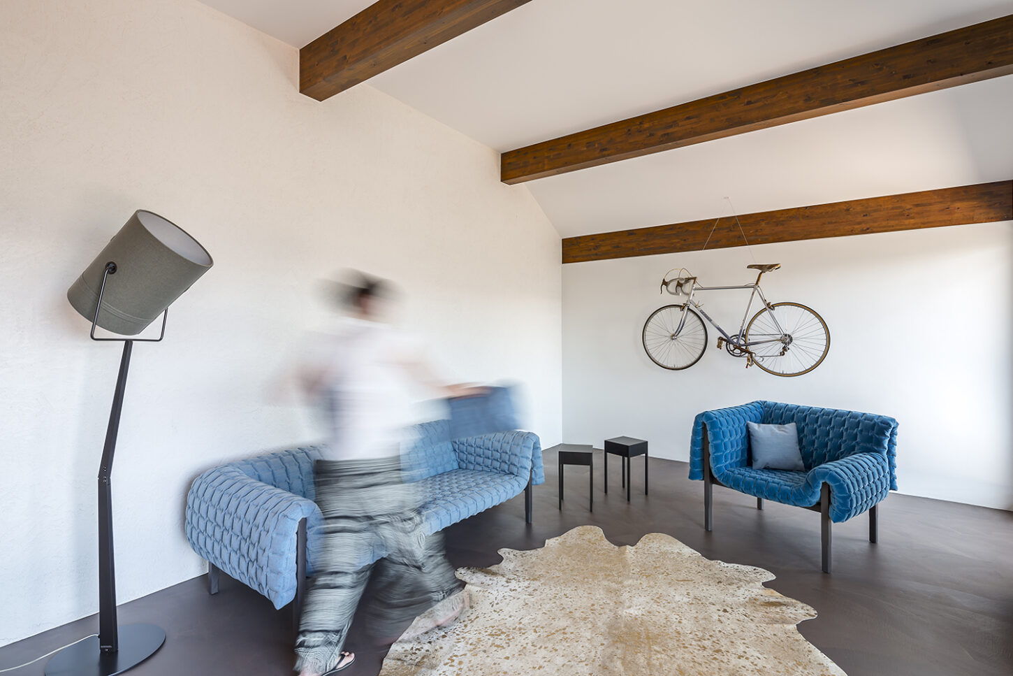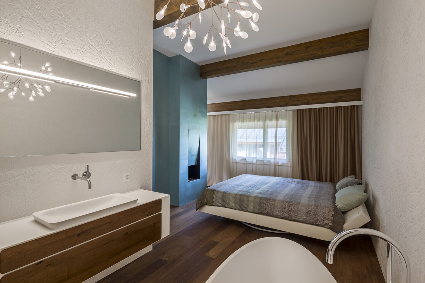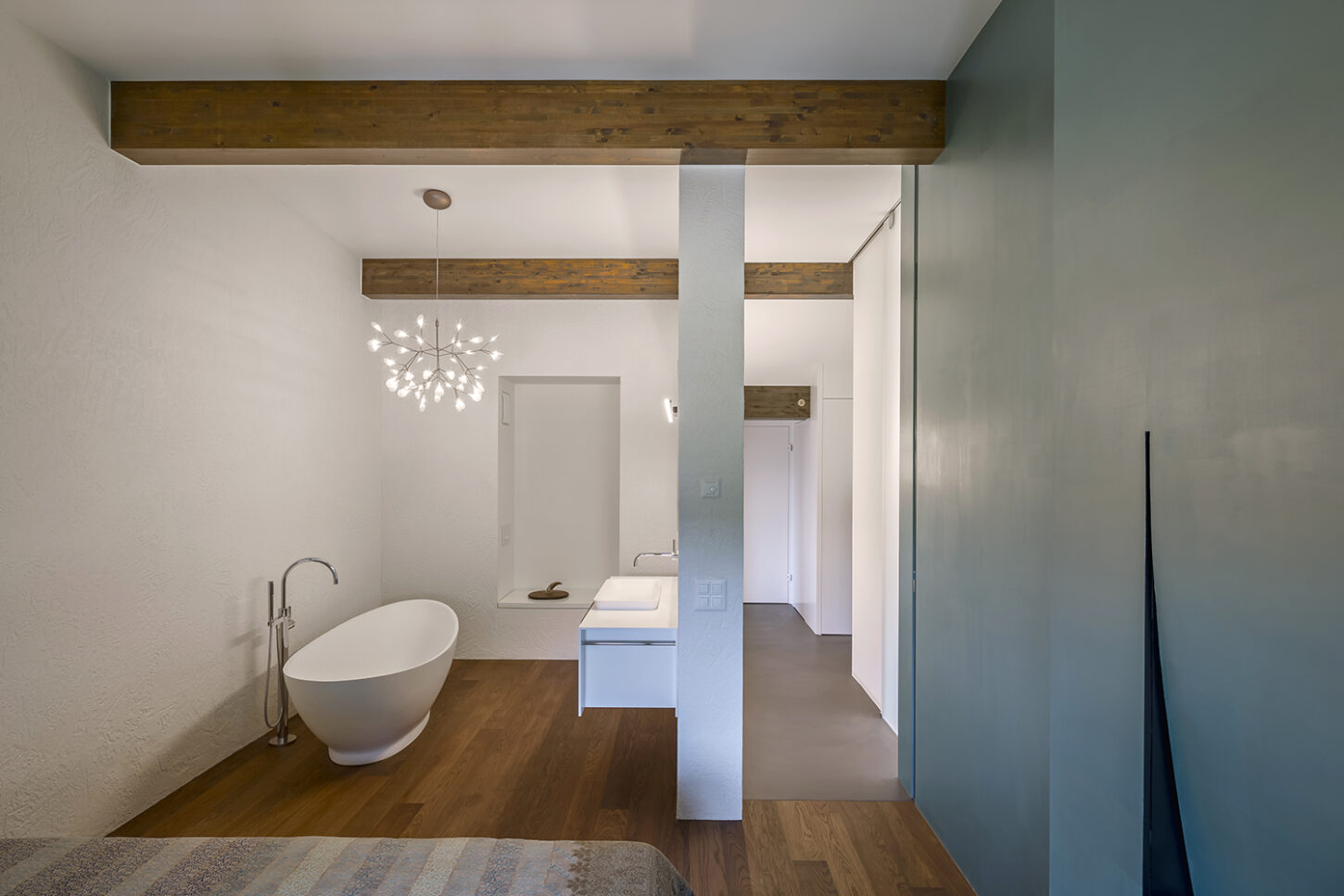 Die kleinen Zimmer und Nassräume entsprachen nicht mehr den heutigen Anforderungen. Sie waren für ein Wohnen im Alter ungeeignet. Die charakteristischen Merkmale der Wohnung sind das gefaltete Dach mit dunklen Balken und die abgerundeten Wände. Mit gezielten Wanddurchbrüchen wurde die kleinteilige Struktur aufgebrochen und in eine grosszügige zusammenhängende Raumabfolge verwandelt. Die raumhohen Schiebetüren unterstützen den Effekt des durchlässigen Raumes und machen das gefaltete Dach erlebbar. Während die Dachuntersicht und die Aussenwände neu mit einem Glattputz versehen wurden, sind die inneren Wandflächen mit unterschiedlichen Putzstrukturen und Zuschlagstoffen gestaltet. Die dunklen Holzbalken binden die Wohnung über alle Räume hinweg, zu einem neuen Ganzen zusammen.