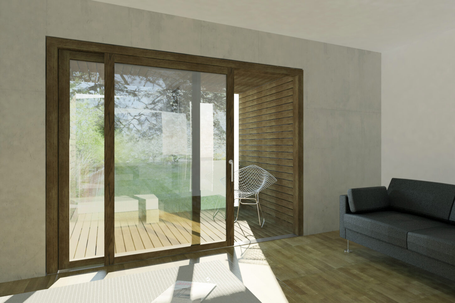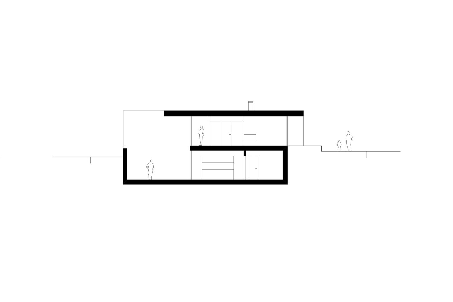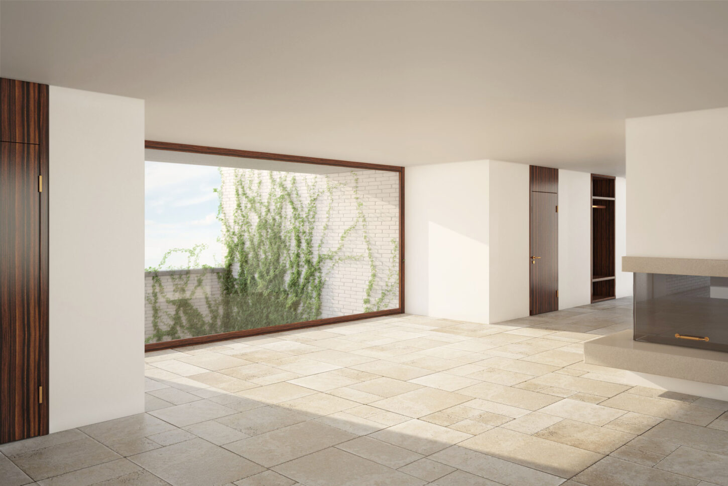 Der Wunsch nach Privatsphäre und Intimität waren zentrale Anliegen der Bauherrschaft. Während sämtliche Wohn- und Schlafräume im leicht erhöhten Hochparterre liegen, sind die Büroräume unter Terrain angeordnet und über einen grosszügigen und bewachsenen Hof belichtet. Die ausdrucksvollen Lorbeer- und Buchenhecken der Nachbarparzellen begrenzen das Grundstück und sind die Basis der Projektidee. Die geschlossenen Raumzellen bieten die Möglichkeit des Rückzugs und der Ruhe. Gleichzeitig definieren sie den zentralen Wohn- und Essraum dazwischen als Mittelpunkt des täglichen Familienlebens. Das Wohnen mit den Holzterrassen im Hochparterre steht in direktem Bezug zum grosszügigen allseitigen präsenten Garten. Die zweischalige Klinkerkonstruktion ist im Innenraum glatt verputzt und wird mit Travertin und dunkeln Holzeinbauten kombiniert.