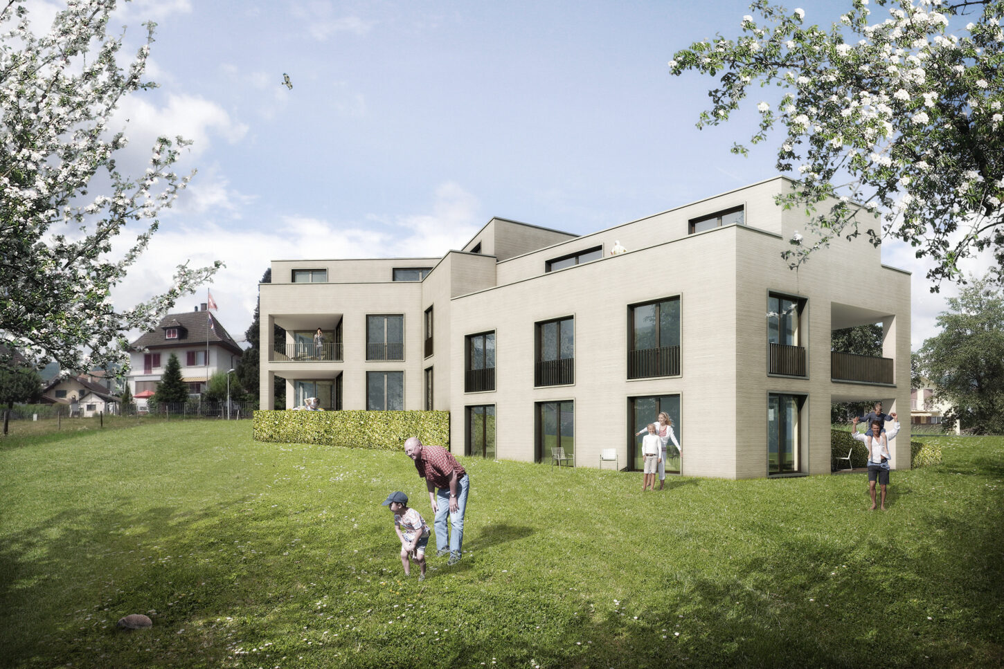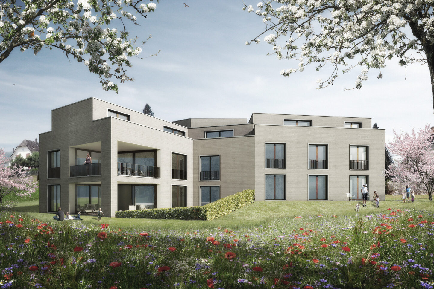 Die 23 Eigentumswohnungen sind Teil der Überbauung am Meierhofweg in Meisterschwanden. Das Projekt liegt zwischen der historischen Villa Fischer mit ihrem Park und dem angrenzenden Gewerbegebiet. Es verbindet die Anforderungen zweier Bauherrschaften und setzt auf ein gemeinsames Konzept von Wohnen und Arbeiten.