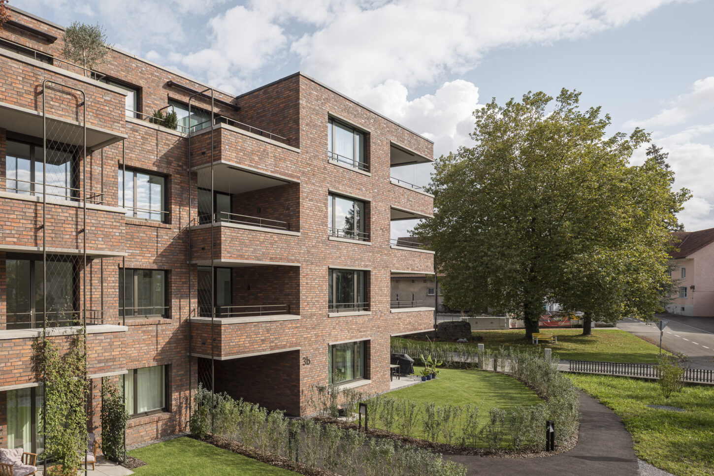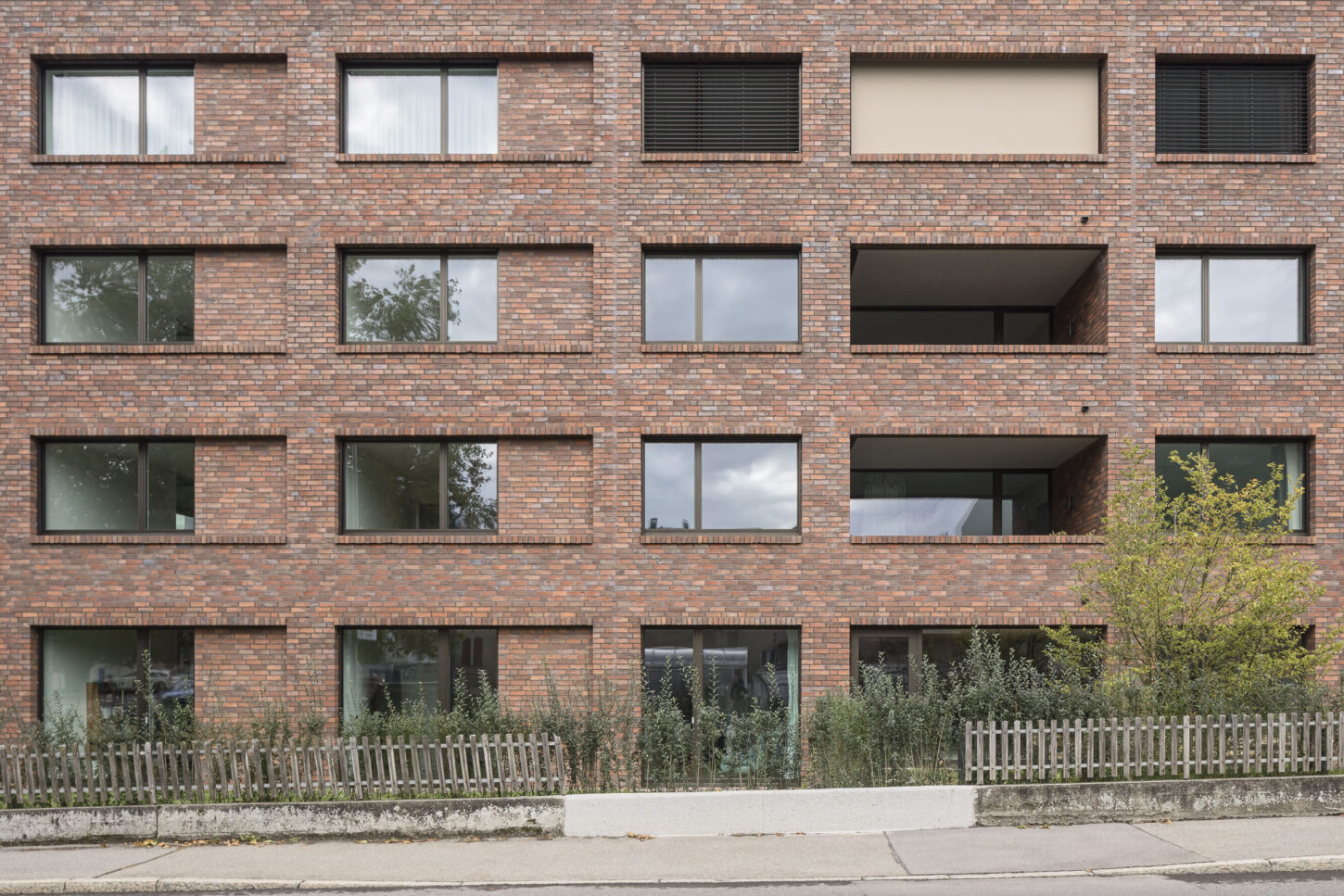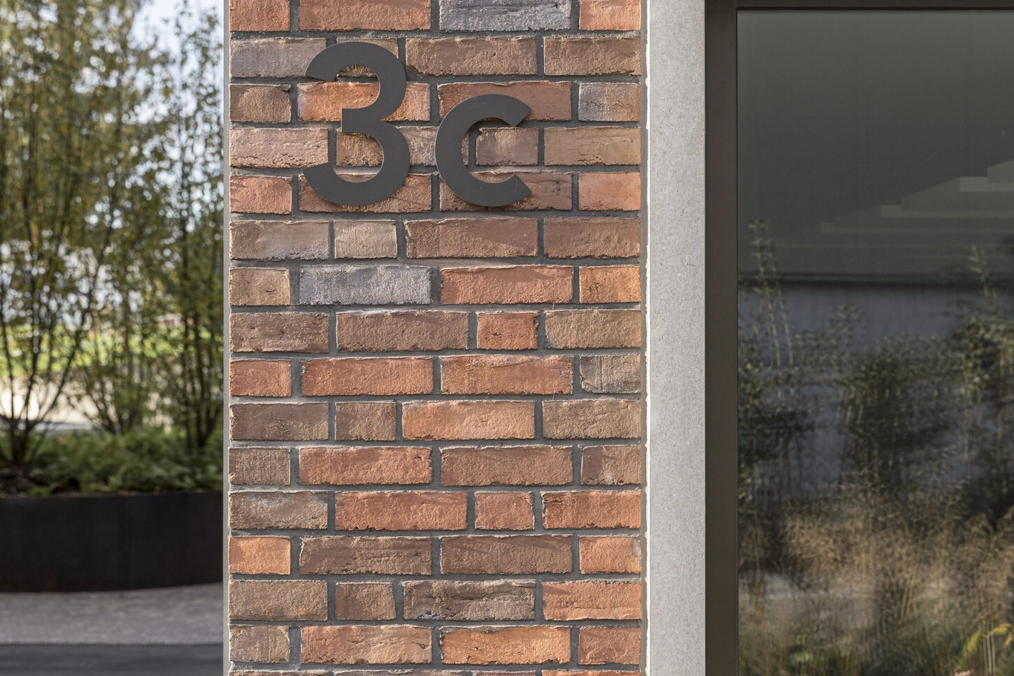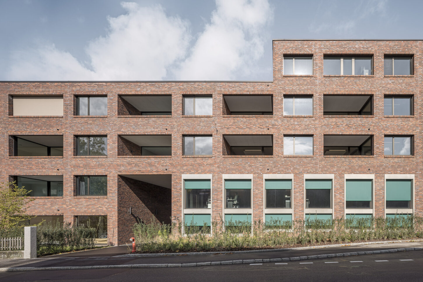 Das Erdgeschoss öffnet sich mit grossformatigen Fenstern und dunkelgrünen Fallarmmarkisen zur Strassenecke und schafft so eine einladende, prägnante Firmenadresse. Im Gegensatz dazu präsentieren sich die internen Gruppenbüros in den Obergeschossen bewusst zurückhaltender. Zur Bahnhofstrasse hin ist die Fassade streng gegliedert und rhythmisch strukturiert – ganz im bewussten Kontrast zu den Wohnungen auf der Südseite zum Park. Aussen bildet die hochwertige, farblich nuancierte Klinkerfassade das prägende Gestaltungselement, das – je nach Licht und Schatten – immer wieder unterschiedlich matt oder in leichtem Glanz in Erscheinung tritt.