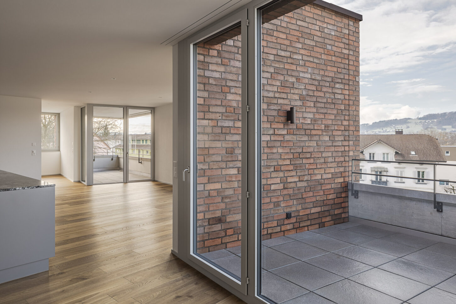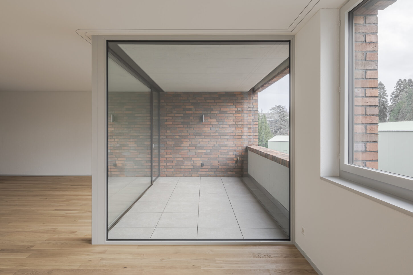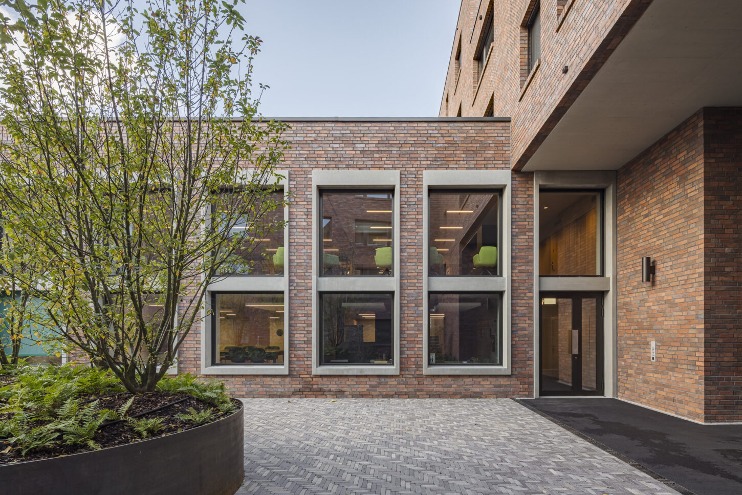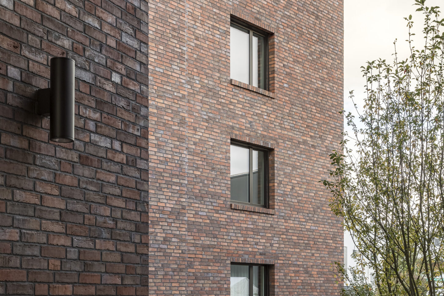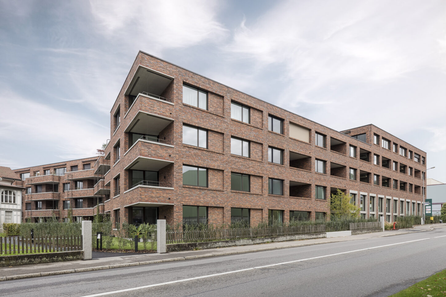 Das Erdgeschoss öffnet sich mit grossformatigen Fenstern und dunkelgrünen Fallarmmarkisen zur Strassenecke und schafft so eine einladende, prägnante Firmenadresse. Im Gegensatz dazu präsentieren sich die internen Gruppenbüros in den Obergeschossen bewusst zurückhaltender. Zur Bahnhofstrasse hin ist die Fassade streng gegliedert und rhythmisch strukturiert – ganz im bewussten Kontrast zu den Wohnungen auf der Südseite zum Park. Aussen bildet die hochwertige, farblich nuancierte Klinkerfassade das prägende Gestaltungselement, das – je nach Licht und Schatten – immer wieder unterschiedlich matt oder in leichtem Glanz in Erscheinung tritt.