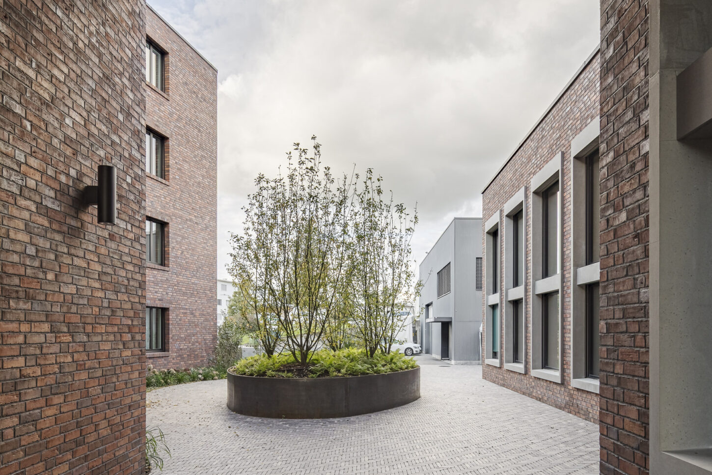 Die lebendige Klinkerfassade verbindet den Wohn- und Gewerbeteil zu einem harmonischen Ganzen. Das begrünte Dach mit Trockenbiotopen, Sandnistplätzen und einheimischer Flora bietet Lebensraum für Wildbienen, Vögel und Insekten. Dafür wurde das Projekt mit dem Zertifikat der Stiftung Natur & Wirtschaft ausgezeichnet.